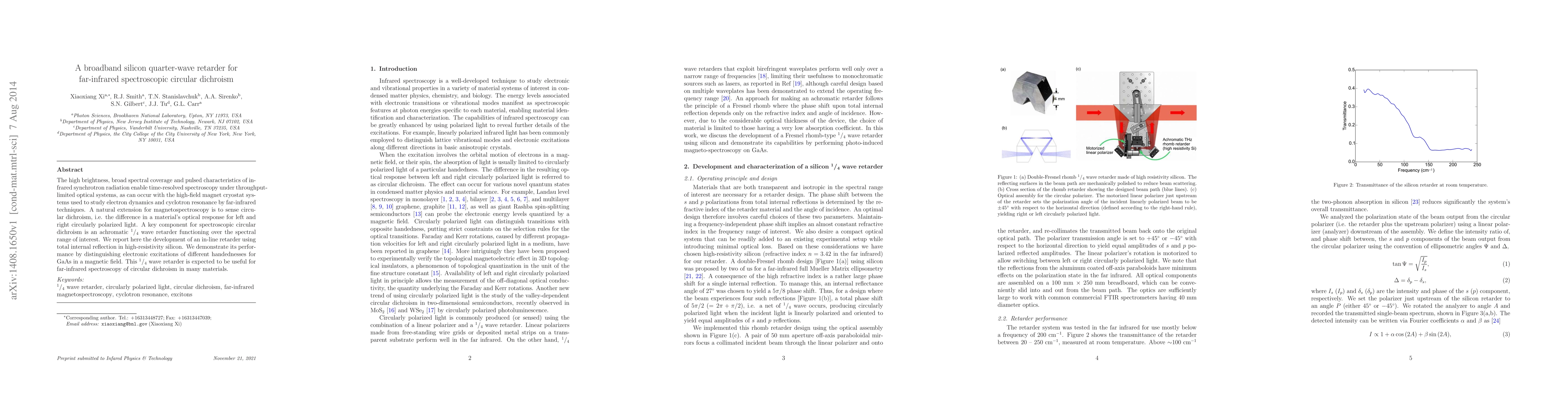 This paper reports the development of a broadband silicon quarter-wave retarder for far-infrared spectroscopic circular dichroism, utilizing total internal reflection in high-resistivity silicon. The device successfully distinguishes electronic excitations of different handednesses in GaAs under magnetic fields, indicating its potential for far-infrared spectroscopy applications.