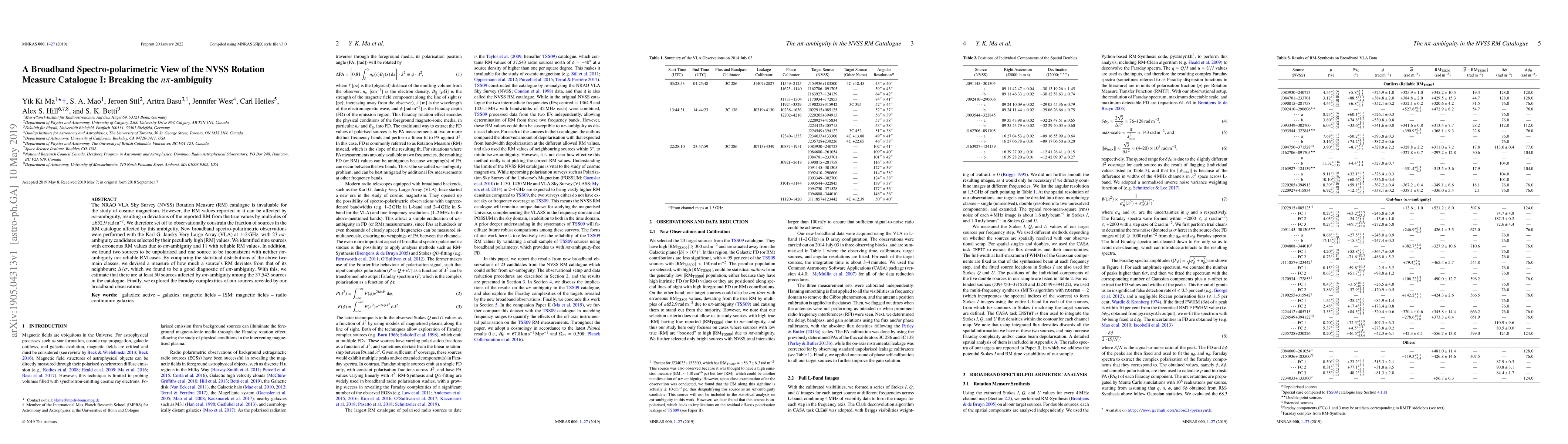 This study uses broadband spectro-polarimetric observations with the VLA to identify and resolve n$\pi$-ambiguity in the NVSS Rotation Measure catalogue, finding at least 50 sources with erroneous RM values. The $\Delta/\sigma$ diagnostic helps distinguish ambiguous from reliable RM values, revealing Faraday complexities in the observed sources.