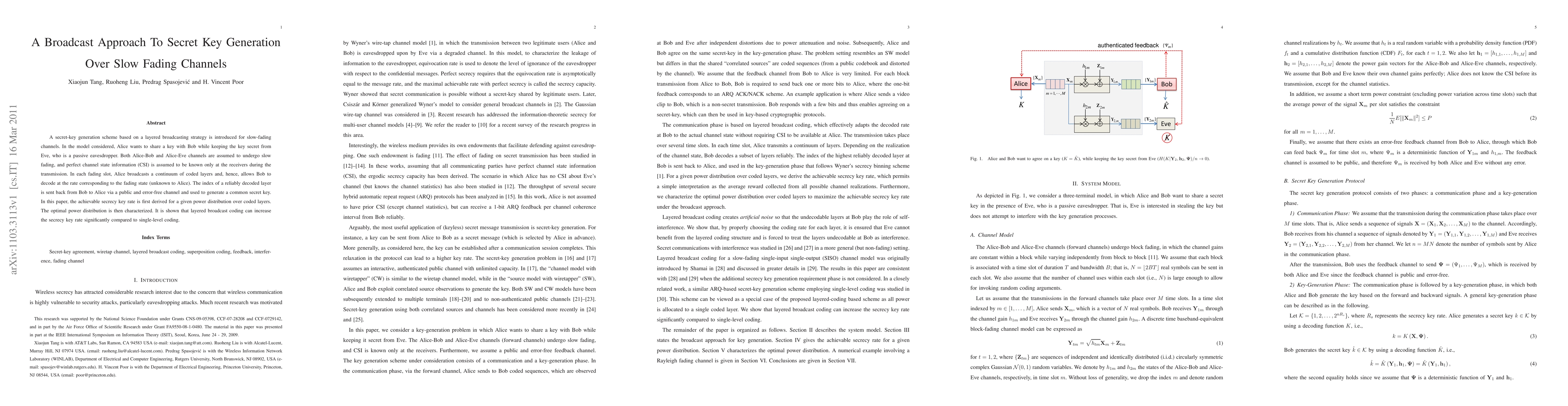 A secret-key generation scheme based on a layered broadcasting strategy is introduced for slow-fading channels. In the model considered, Alice wants to share a key with Bob while keeping the key secret from Eve, who is a passive eavesdropper. Both Alice-Bob and Alice-Eve channels are assumed to undergo slow fading, and perfect channel state information (CSI) is assumed to be known only at the receivers during the transmission. In each fading slot, Alice broadcasts a continuum of coded layers and, hence, allows Bob to decode at the rate corresponding to the fading state (unknown to Alice). The index of a reliably decoded layer is sent back from Bob to Alice via a public and error-free channel and used to generate a common secret key. In this paper, the achievable secrecy key rate is first derived for a given power distribution over coded layers. The optimal power distribution is then characterized. It is shown that layered broadcast coding can increase the secrecy key rate significantly compared to single-level coding.