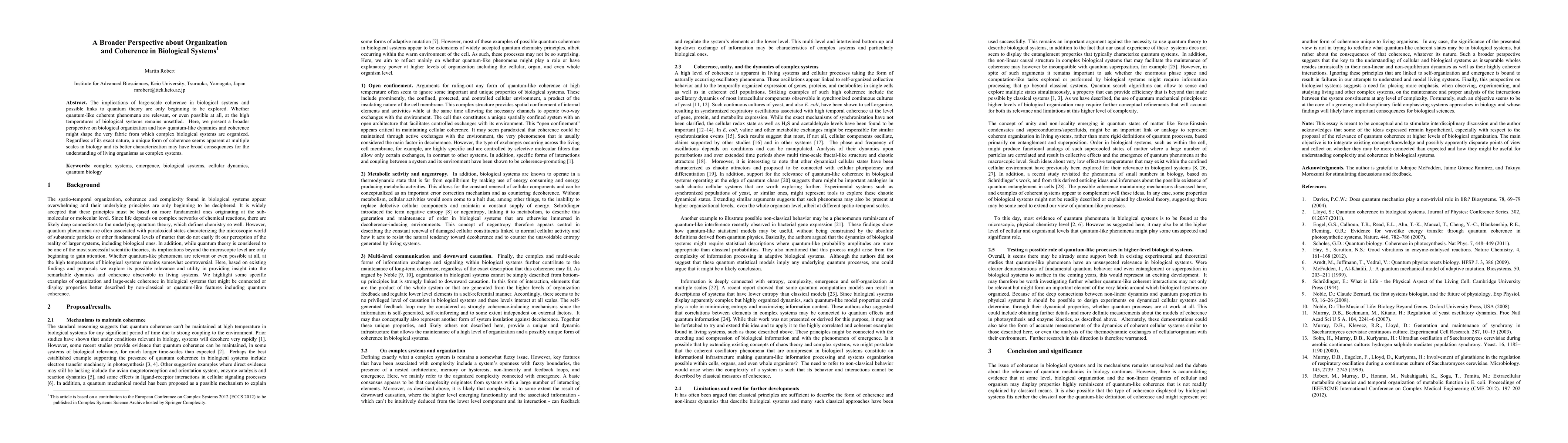 This paper explores the potential implications of large-scale coherence in biological systems, investigating whether quantum-like phenomena could play a role at high temperatures. It suggests that a unique form of coherence may shape biological organization and that its characterization could significantly impact our understanding of complex biological systems.