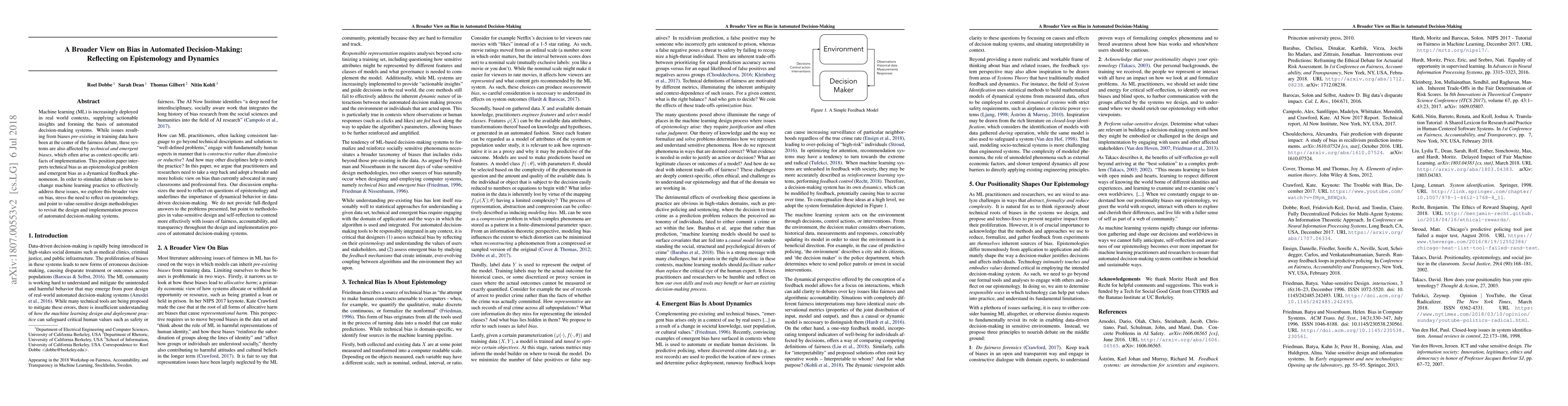 This paper examines biases in automated decision-making systems, framing technical bias as an epistemological issue and emergent bias as a dynamical feedback phenomenon. It advocates for a broader view on bias and suggests value-sensitive design methodologies to improve machine learning practices.