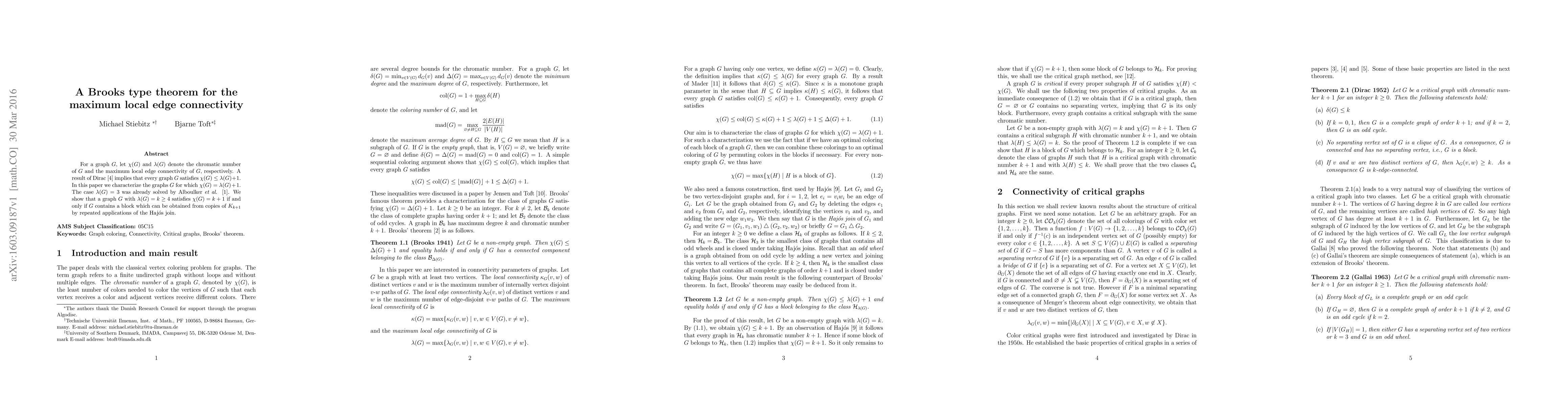 For a graph $G$, let $\cn(G)$ and $\la(G)$ denote the chromatic number of $G$ and the maximum local edge connectivity of $G$, respectively. A result of Dirac \cite{Dirac53} implies that every graph $G$ satisfies $\cn(G)\leq \la(G)+1$. In this paper we characterize the graphs $G$ for which $\cn(G)=\la(G)+1$. The case $\la(G)=3$ was already solved by Alboulker {\em et al.\,} \cite{AlboukerV2016}. We show that a graph $G$ with $\la(G)=k\geq 4$ satisfies $\cn(G)=k+1$ if and only if $G$ contains a block which can be obtained from copies of $K_{k+1}$ by repeated applications of the Haj\'os join.