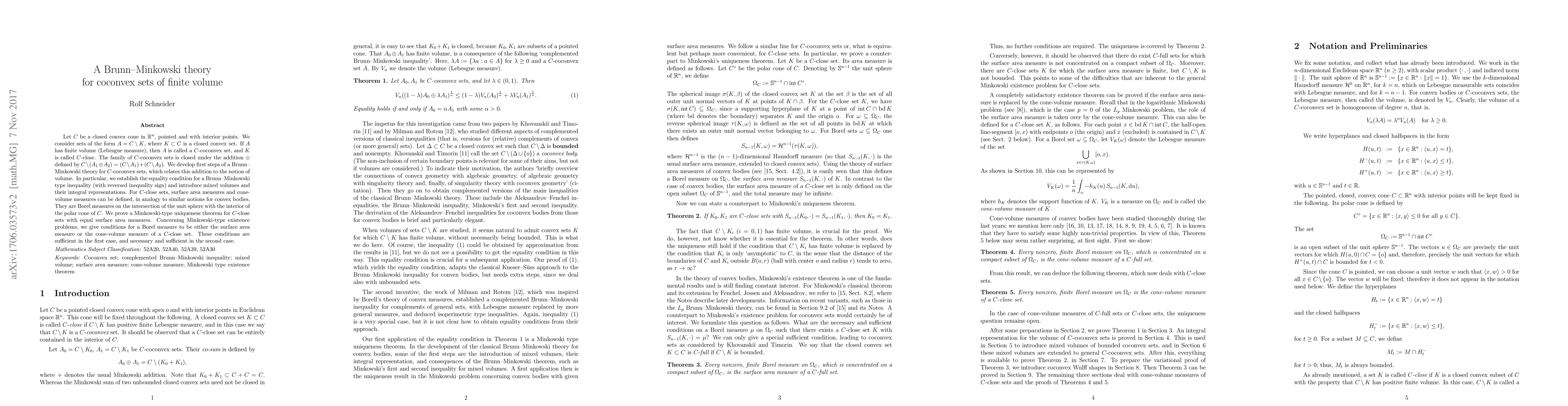 Let $C$ be a closed convex cone in ${\mathbb R}^n$, pointed and with interior points. We consider sets of the form $A=C\setminus A^\bullet$, where $A^\bullet\subset C$ is a closed convex set. If $A$ has finite volume (Lebesgue measure), then $A$ is called a $C$-coconvex set. The family of $C$-coconvex sets is closed under the addition $\oplus$ defined by $C\setminus(A_1\oplus A_2)= (C\setminus A_1)+(C\setminus A_2)$. We develop first steps of a Brunn--Minkowski theory for $C$-coconvex sets, which relates this addition to the notion of volume. In particular, we establish the equality conditions for a Brunn--Minkowski type inequality (with reversed inequality sign), introduce mixed volumes and their integral representations, and prove a Minkowski-type uniqueness theorem for $C$-coconvex sets with equal surface area measures.
