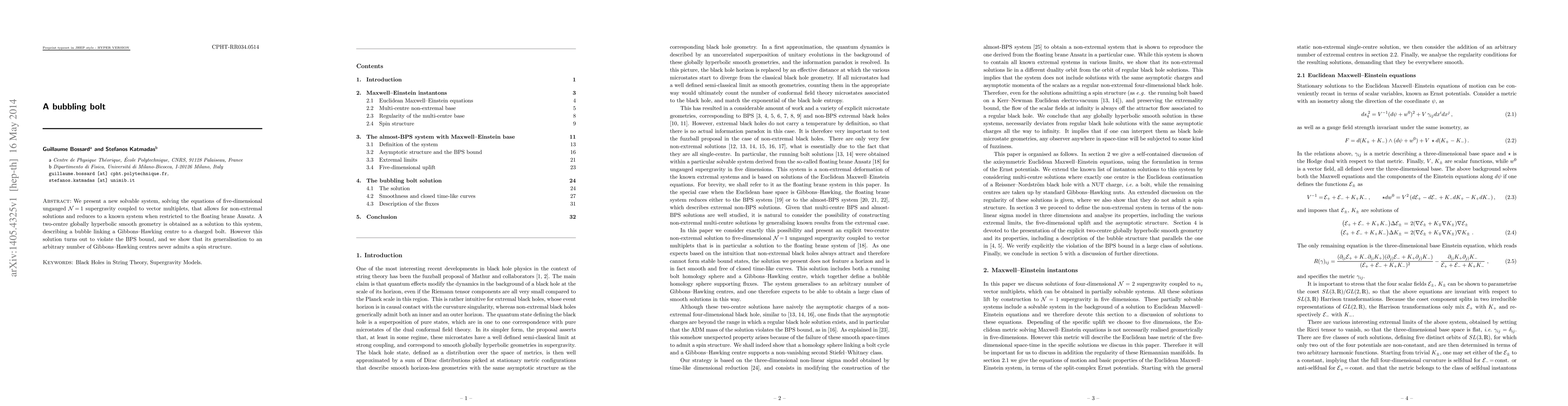 We present a new solvable system, solving the equations of five-dimensional ungauged N=1 supergravity coupled to vector multiplets, that allows for non-extremal solutions and reduces to a known system when restricted to the floating brane Ansatz. A two-centre globally hyperbolic smooth geometry is obtained as a solution to this system, describing a bubble linking a Gibbons--Hawking centre to a charged bolt. However this solution turns out to violate the BPS bound, and we show that its generalisation to an arbitrary number of Gibbons--Hawking centres never admits a spin structure.