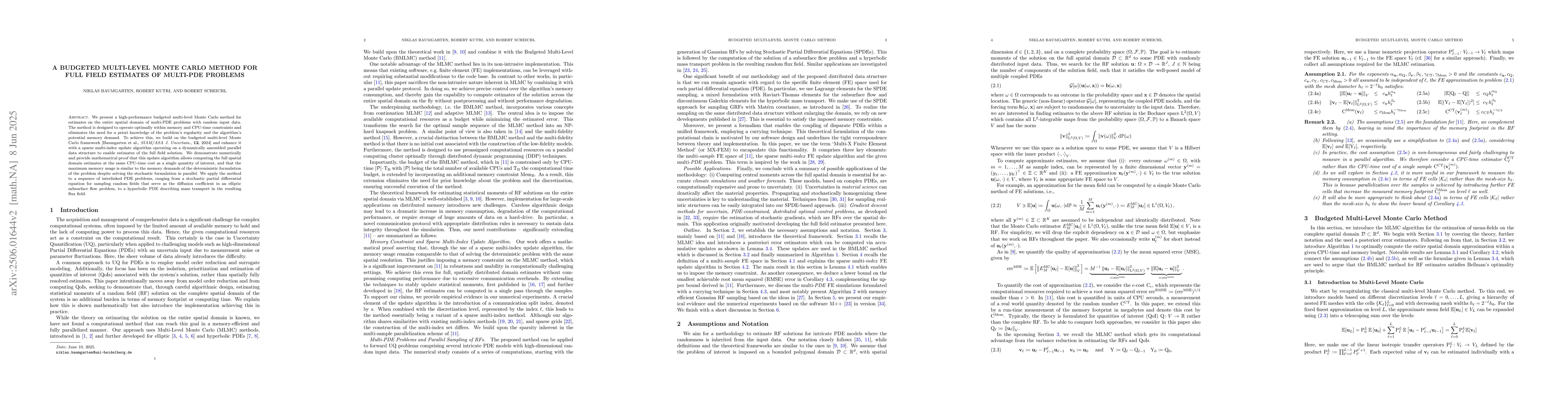 We present a high-performance budgeted multi-level Monte Carlo method for estimates on the entire spatial domain of multi-PDE problems with random input data. The method is designed to operate optimally within memory and CPU-time constraints and eliminates the need for a priori knowledge of the problem's regularity and the algorithm's potential memory demand. To achieve this, we build on the budgeted multi-level Monte Carlo framework and enhance it with a sparse multi-index update algorithm operating on a dynamically assembled parallel data structure to enable estimates of the full field solution. We demonstrate numerically and provide mathematical proof that this update algorithm allows computing the full spatial domain estimates at the same CPU-time cost as a single quantity of interest, and that the maximum memory usage is similar to the memory demands of the deterministic formulation of the problem despite solving the stochastic formulation in parallel. We apply the method to a sequence of interlinked PDE problems, ranging from a stochastic partial differential equation for sampling random fields that serve as the diffusion coefficient in an elliptic subsurface flow problem, to a hyperbolic PDE describing mass transport in the resulting flux field.