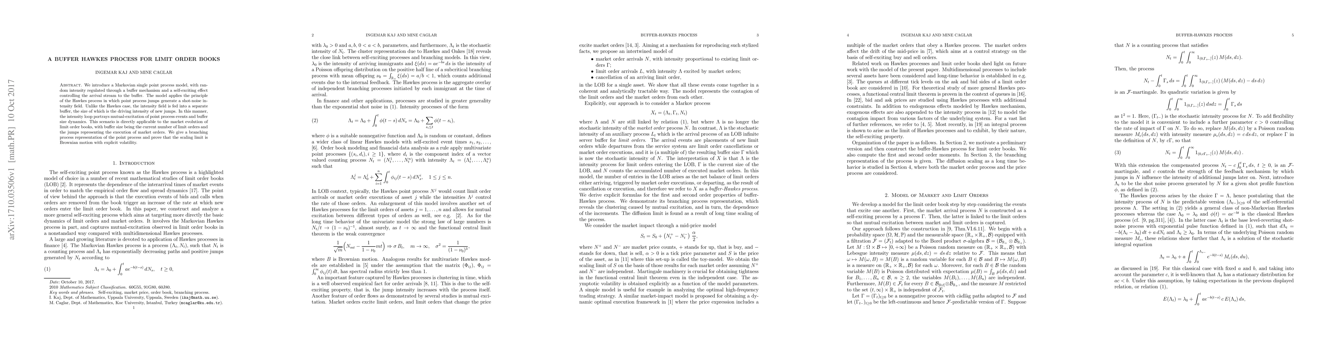 This paper introduces a Markovian single point process model for limit order books, where a buffer mechanism regulates intensity and self-exciting effects control jump arrivals. The model uses a buffer to represent the number of limit orders, with jumps symbolizing market order executions, and proves that the scaling limit of the process is Brownian motion with explicit volatility.