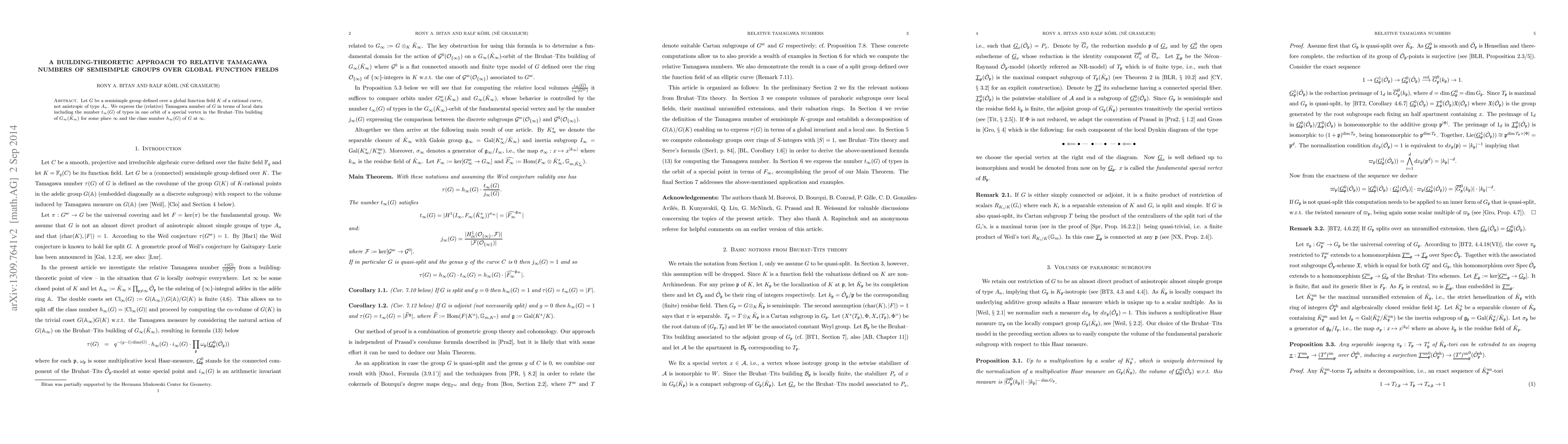 This paper establishes a new approach to calculating relative Tamagawa numbers for semi-split groups over global function fields, using local data from the Bruhat-Tits building and class numbers of the group at specific places.