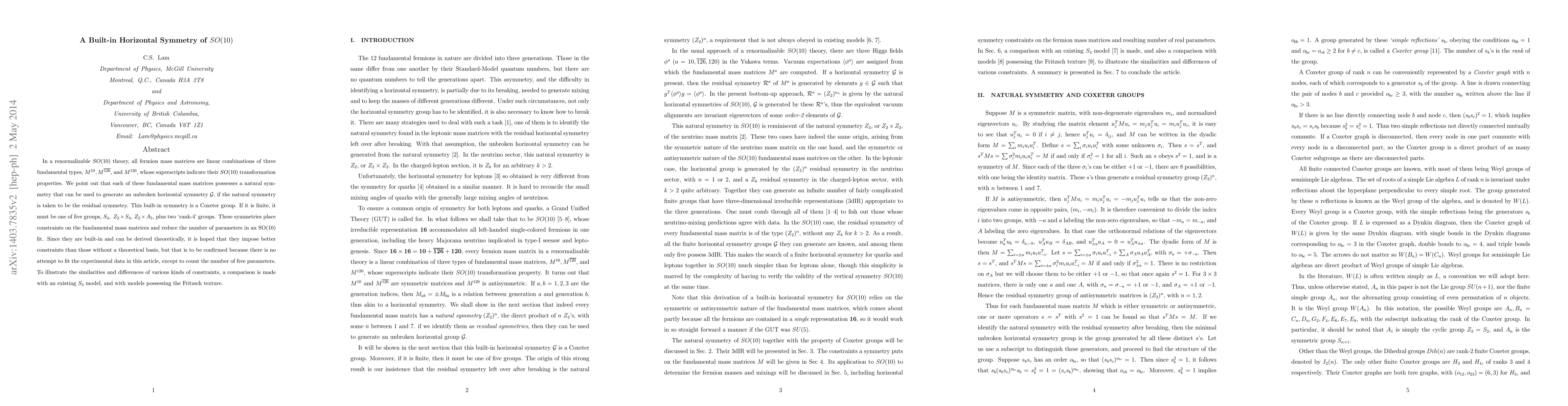 This paper explores the inherent horizontal symmetry in a renormalizable $SO(10)$ theory, identifying that the fundamental mass matrices exhibit natural symmetries that can generate an unbroken horizontal symmetry group $\G$. The built-in symmetry is a Coxeter group, potentially finite, and if so, one of five specific groups, which constrains the mass matrices and reduces parameters in an SO(10) model fit.