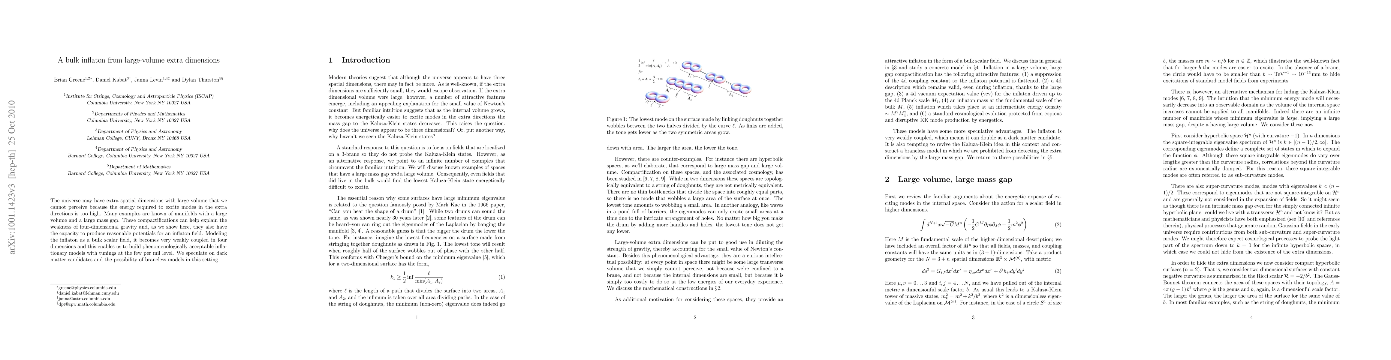 This paper explores the potential of large volume extra dimensions to provide a weakly coupled bulk inflaton field, enabling phenomenologically viable inflationary models with minimal tuning. It also discusses implications for dark matter and the feasibility of braneless models.