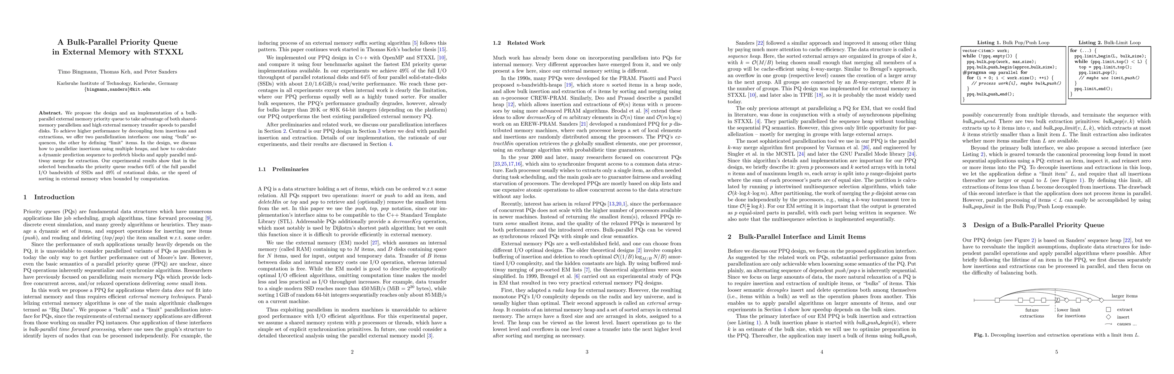 This paper introduces a bulk-parallel external memory priority queue implemented with STXXL, leveraging shared-memory parallelism and high disk I/O speeds. The proposed design achieves optimal performance through parallel insertions using multiple heaps and a dynamic prediction sequence for block prefetching, along with parallel multiway merge for extractions.