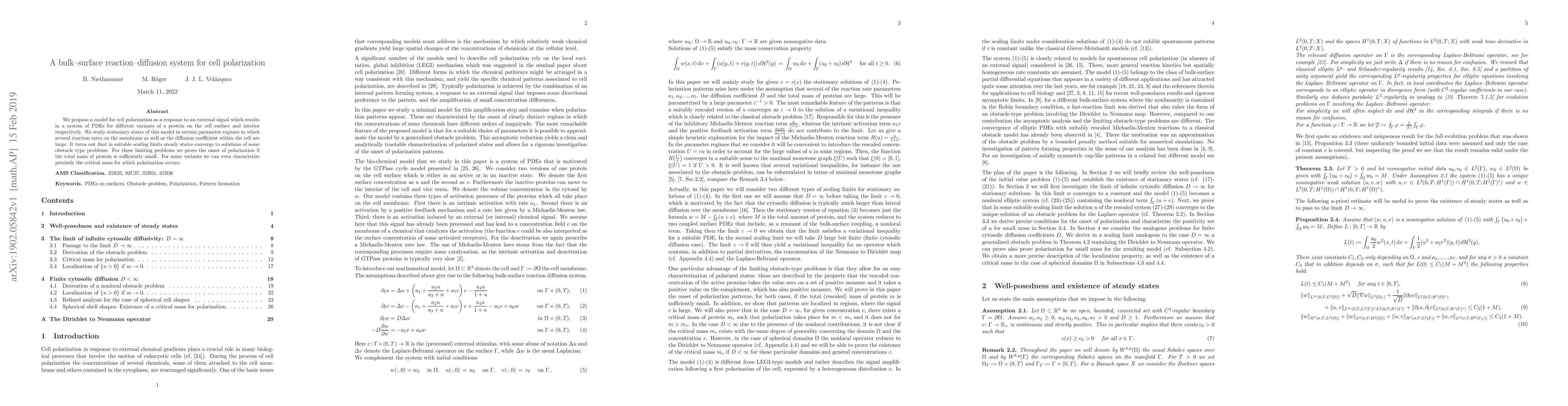 This paper proposes a reaction-diffusion model for cell polarization in response to external signals, focusing on protein dynamics on the cell surface and interior. It demonstrates that under certain conditions, steady states converge to solutions of obstacle type problems, proving polarization onset when the total protein mass is sufficiently low.
