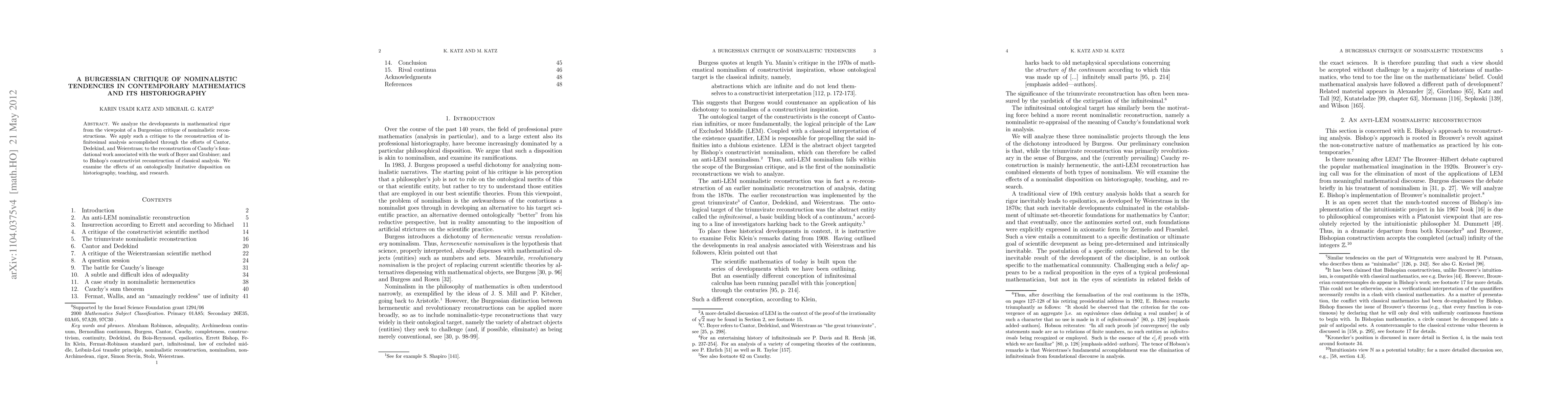 This paper critiques nominalistic tendencies in modern mathematics and its history, analyzing reconstructions of infinitesimal analysis and Cauchy's foundational work through a Burgessian perspective. It examines the effects of nominalism on historiography, teaching, and research.