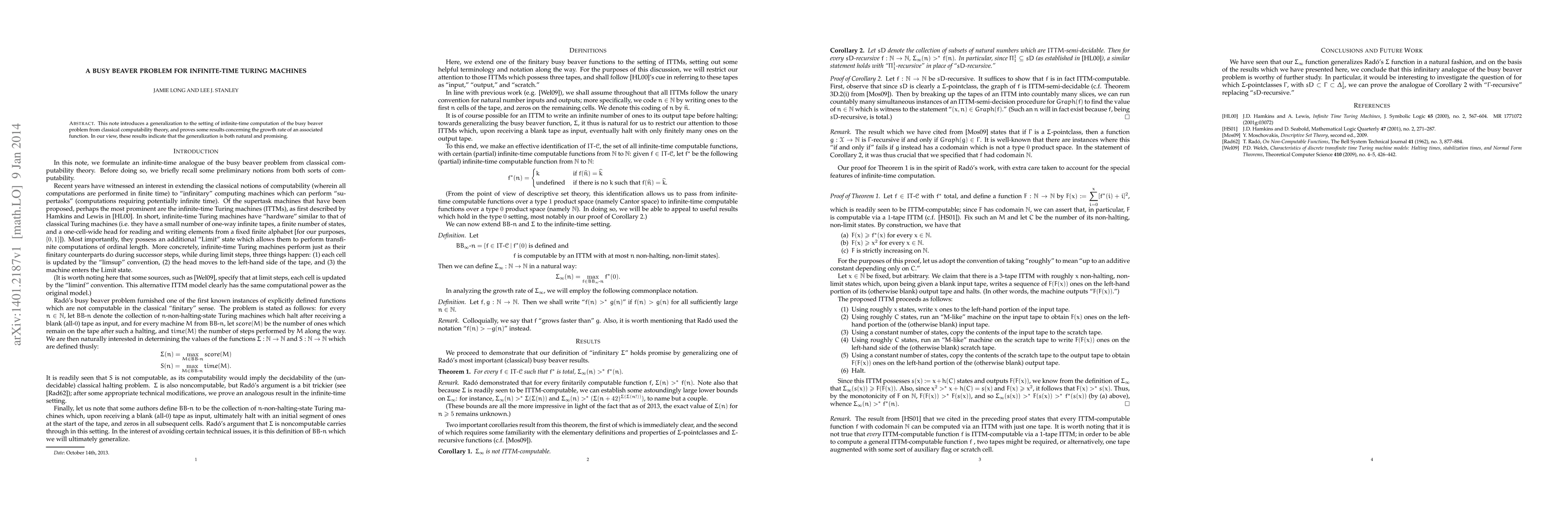 This paper extends the concept of the busy beaver problem to infinite-time Turing machines, exploring the growth rate of an associated function. The results suggest that this generalization is both logical and holds potential for further study.