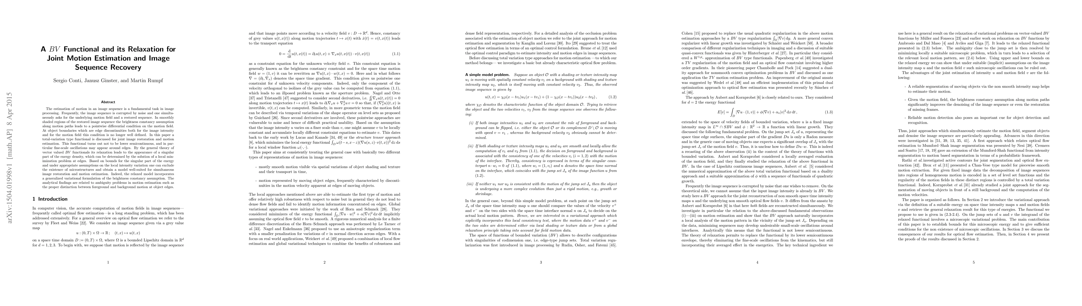 The estimation of motion in an image sequence is a fundamental task in image processing. Frequently, the image sequence is corrupted by noise and one simultaneously asks for the underlying motion field and a restored sequence. In smoothly shaded regions of the restored image sequence the brightness constancy assumption along motion paths leads to a pointwise differential condition on the motion field. At object boundaries which are edge discontinuities both for the image intensity and for the motion field this condition is no longer well defined. In this paper a total-variation type functional is discussed for joint image restoration and motion estimation. This functional turns out not to be lower semicontinuous, and in particular fine-scale oscillations may appear around edges. By the general theory of vector valued $BV$ functionals its relaxation leads to the appearance of a singular part of the energy density, which can be determined by the solution of a local minimization problem at edges. Based on bounds for the singular part of the energy and under appropriate assumptions on the local intensity variation one can exclude the existence of microstructures and obtain a model well-suited for simultaneous image restoration and motion estimation. Indeed, the relaxed model incorporates a generalized variational formulation of the brightness constancy assumption. The analytical findings are related to ambiguity problems in motion estimation such as the proper distinction between foreground and background motion at object edges.