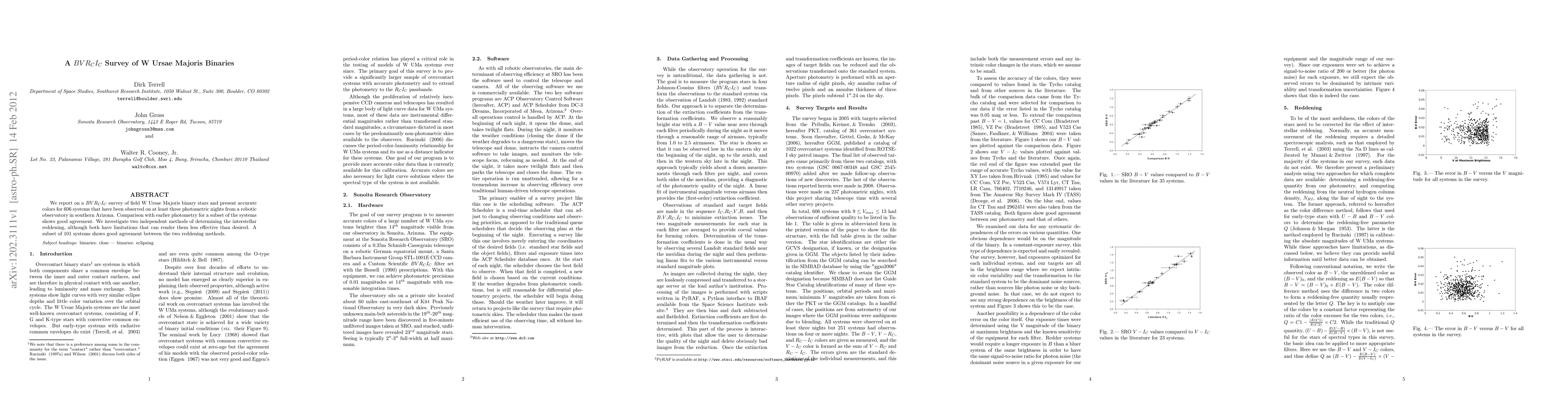 This paper presents a BVRcIc survey of W Ursae Majoris binary stars, providing accurate colors for 606 systems observed over multiple nights. It also compares two methods for determining interstellar reddening, finding good agreement for a subset of 101 systems.