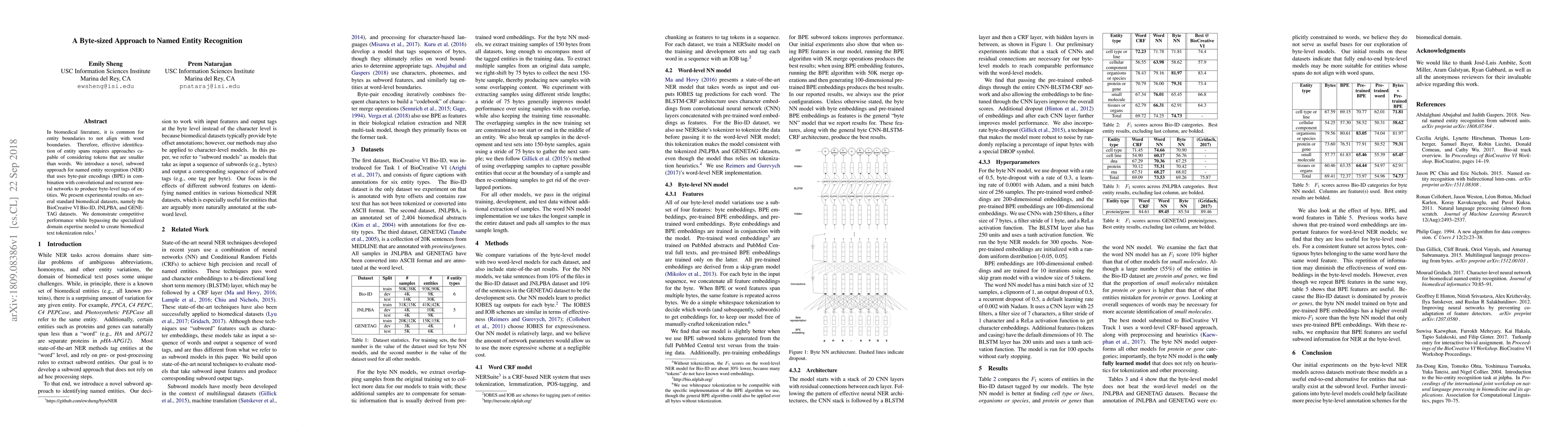 In biomedical literature, it is common for entity boundaries to not align with word boundaries. Therefore, effective identification of entity spans requires approaches capable of considering tokens that are smaller than words. We introduce a novel, subword approach for named entity recognition (NER) that uses byte-pair encodings (BPE) in combination with convolutional and recurrent neural networks to produce byte-level tags of entities. We present experimental results on several standard biomedical datasets, namely the BioCreative VI Bio-ID, JNLPBA, and GENETAG datasets. We demonstrate competitive performance while bypassing the specialized domain expertise needed to create biomedical text tokenization rules.