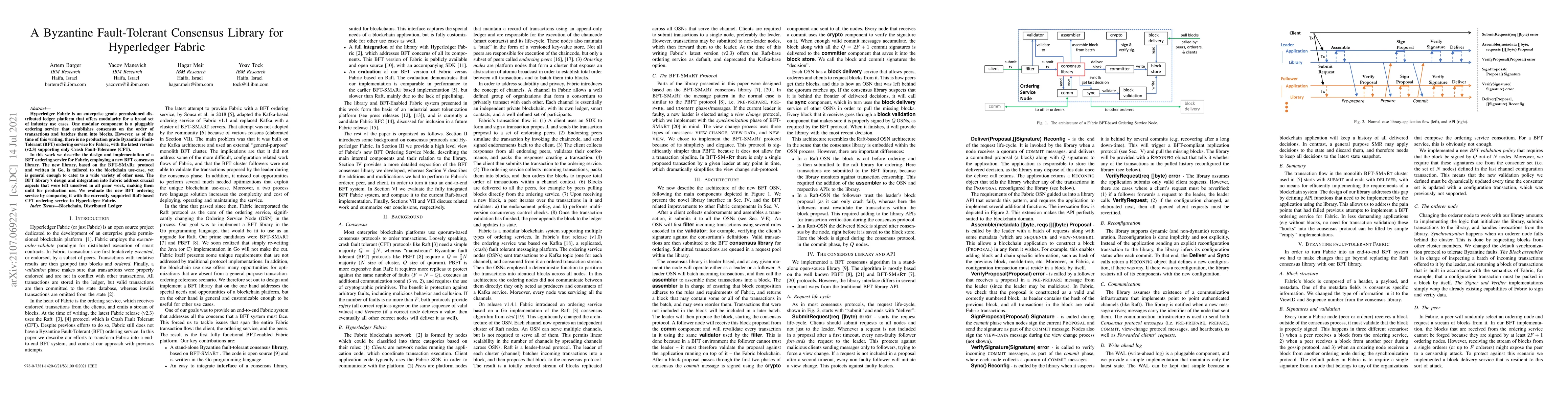 The paper presents a novel BFT consensus library based on the BFT-Smart protocol, tailored for blockchain use-cases while remaining general for other applications, along with its integration into Hyperledger Fabric.