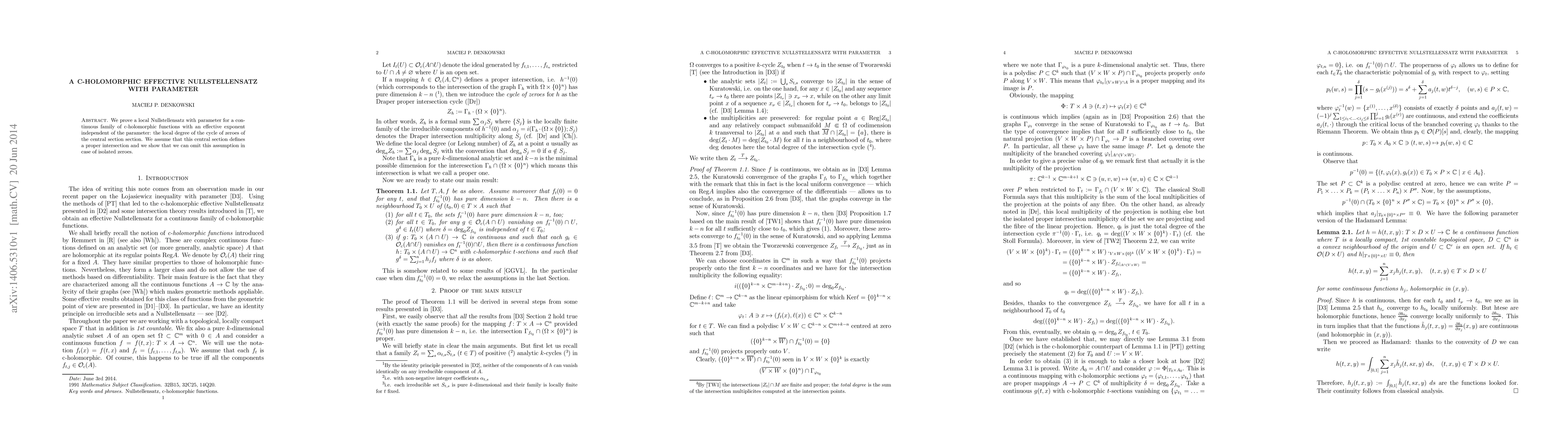 This research establishes a local Nullstellensatz with parameter for a continuous family of c-holomorphic functions, maintaining an effective exponent unaffected by the parameter. The study demonstrates that the local degree of the cycle of zeroes of the central section can be independent of proper intersection assumptions for isolated zeroes.