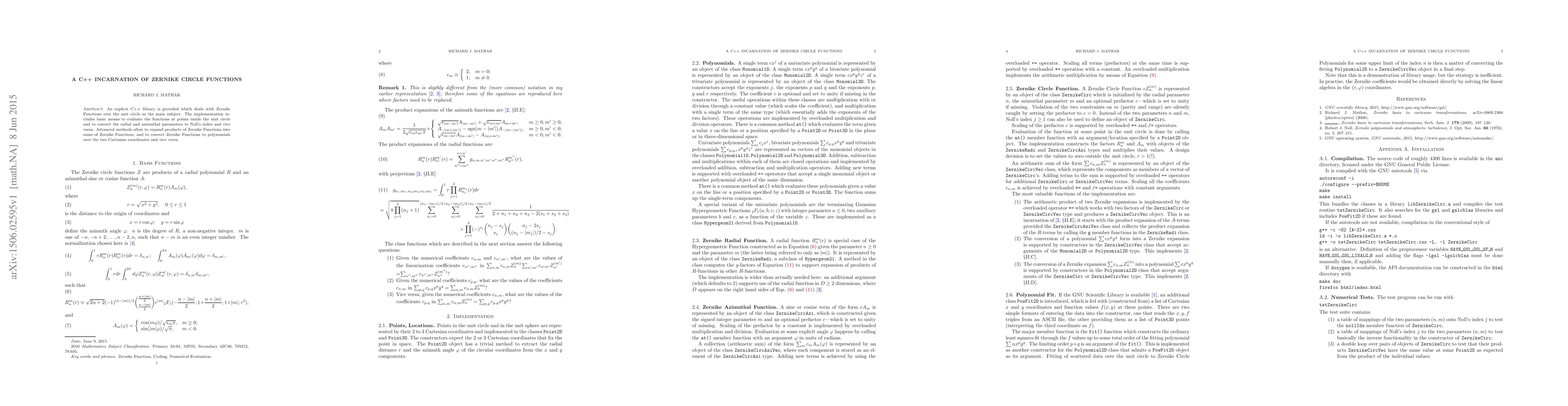 This paper presents a C++ library for evaluating Zernike functions over the unit circle, including methods for function evaluation, parameter conversion, and advanced operations like expanding products into sums and converting between Zernike functions and Cartesian polynomials.