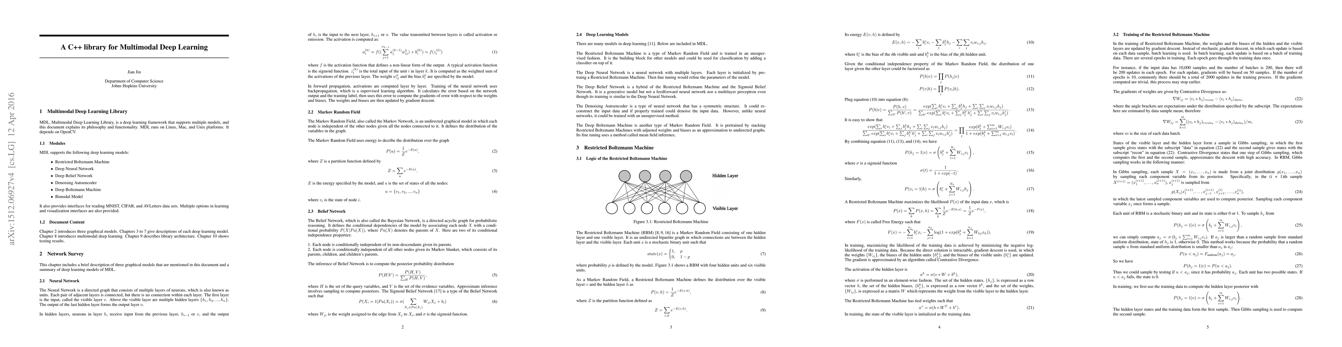 Summary: MDL is a C++ library for Multimodal Deep Learning that supports various models and operates on Linux, Mac, and Unix. It leverages OpenCV and outlines its design philosophy and capabilities.
