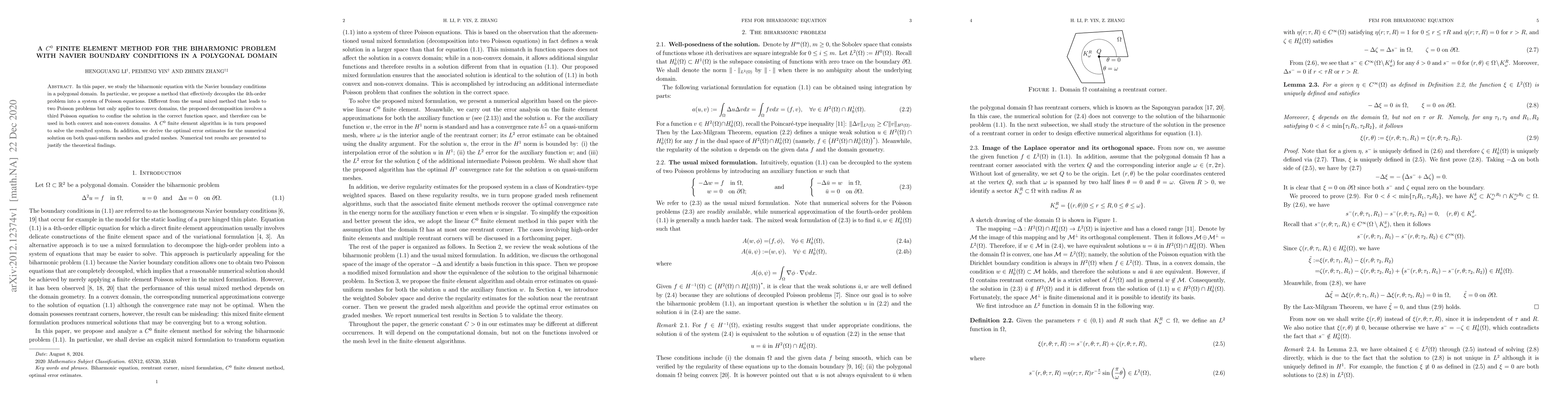 In this paper, we study the biharmonic equation with the Navier boundary conditions in a polygonal domain. In particular, we propose a method that effectively decouples the 4th-order problem into a system of Poisson equations. Different from the usual mixed method that leads to two Poisson problems but only applies to convex domains, the proposed decomposition involves a third Poisson equation to confine the solution in the correct function space, and therefore can be used in both convex and non-convex domains. A $C^0$ finite element algorithm is in turn proposed to solve the resulted system. In addition, we derive the optimal error estimates for the numerical solution on both quasi-uniform meshes and graded meshes. Numerical test results are presented to justify the theoretical findings.
