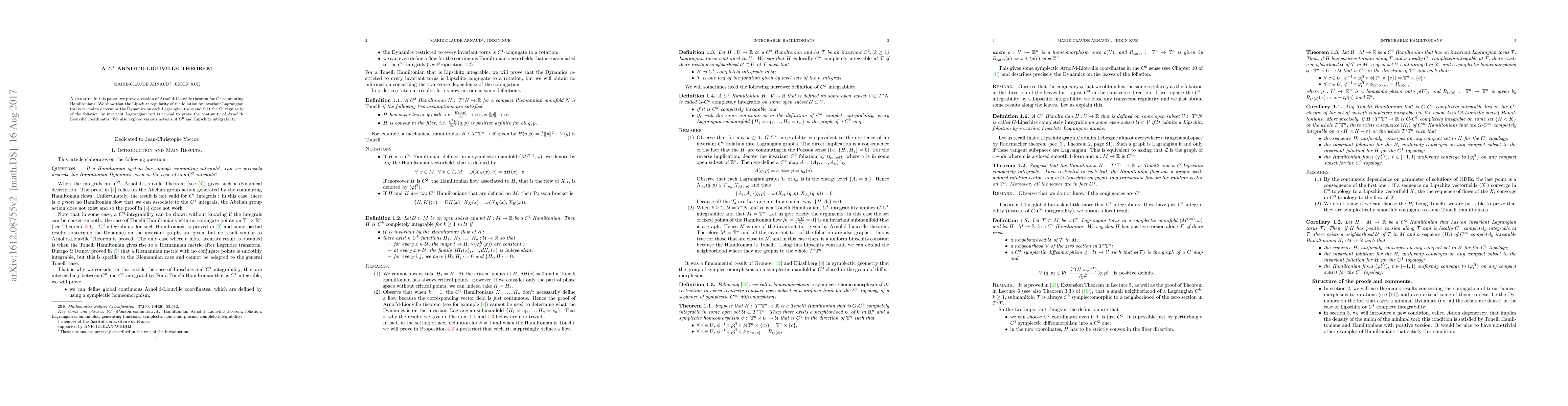 This paper proves a C1 version of the Arnol'd-Liouville theorem for commuting Hamiltonians, emphasizing the importance of Lipschitz regularity of invariant Lagrangian tori for dynamics and the C1 regularity for continuity of Arnol'd-Liouville coordinates. It also investigates different notions of integrability.