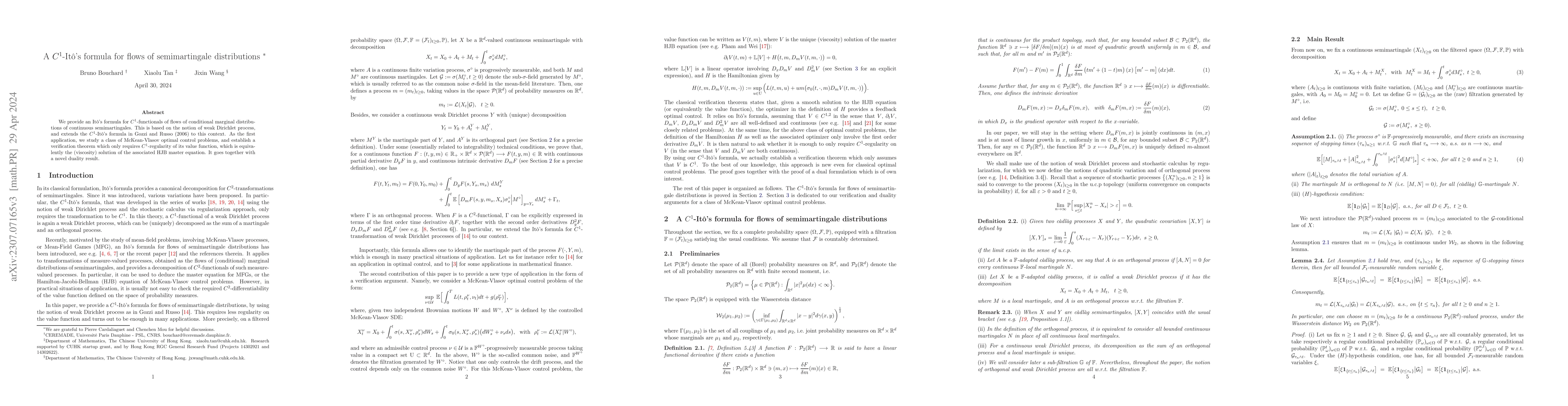 We provide an It\^o's formula for $C^1$-functionals of flows of conditional marginal distributions of continuous semimartingales. This is based on the notion of weak Dirichlet process, and extends the $C^1$-It\^o's formula in Gozzi and Russo (2006) to this context. As the first application, we study a class of McKean-Vlasov optimal control problems, and establish a verification theorem which only requires $C^1$-regularity of its value function, which is equivalently the (viscosity) solution of the associated HJB master equation. It goes together with a novel duality result.