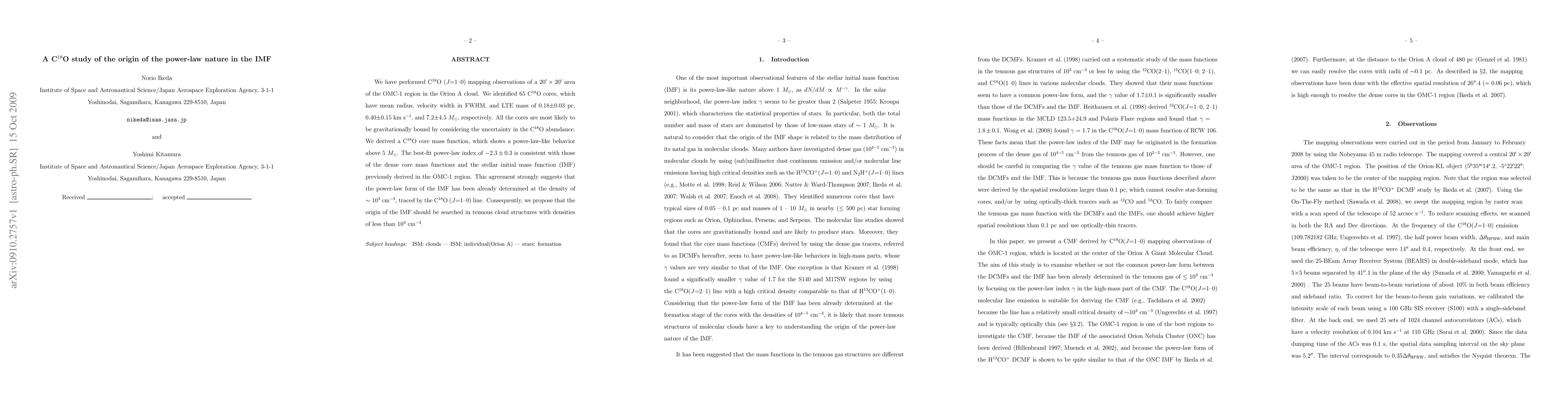We have performed C$^{18}$O ($J$=1--0) mapping observations of a $20'\times20'$ area of the OMC-1 region in the Orion A cloud. We identified 65 C$^{18}$O cores, which have mean radius, velocity width in FWHM, and LTE mass of 0.18$\pm$0.03 pc, 0.40$\pm$0.15 km s$^{-1}$, and 7.2$\pm$4.5 $M_\odot$, respectively. All the cores are most likely to be gravitationally bound by considering the uncertainty in the C$^{18}$O abundance. We derived a C$^{18}$O core mass function, which shows a power-law-like behavior above 5 $M_\odot$. The best-fit power-law index of $-2.3\pm0.3$ is consistent with those of the dense core mass functions and the stellar initial mass function (IMF) previously derived in the OMC-1 region. This agreement strongly suggests that the power-law form of the IMF has been already determined at the density of $\sim10^{3}$ cm$^{-3}$, traced by the C$^{18}$O ($J$=1--0) line.