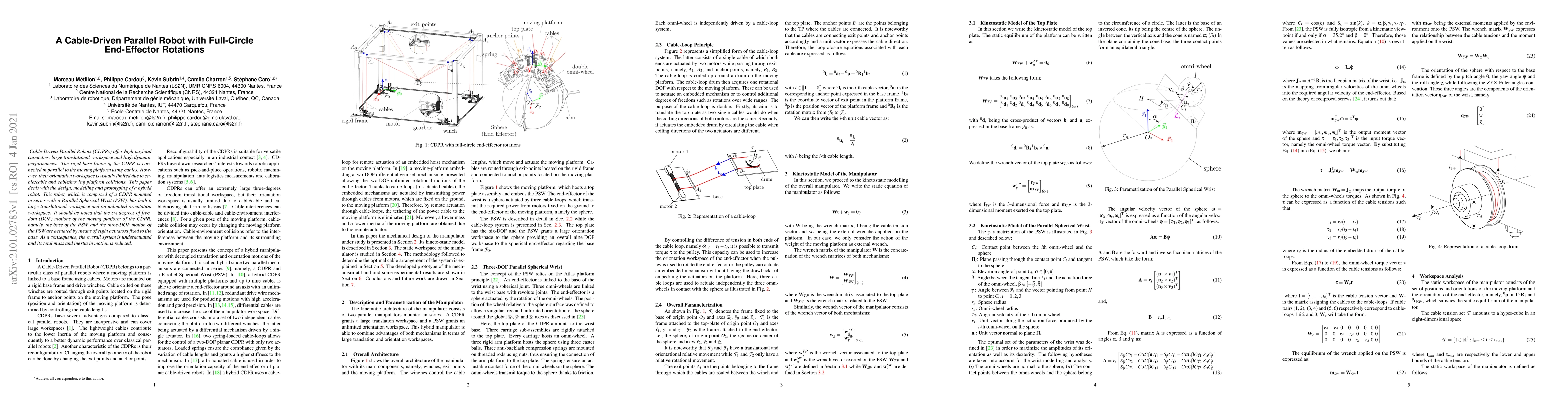 This paper presents a hybrid cable-driven parallel robot combining a CDPR with a Parallel Spherical Wrist (PSW) to achieve a large translational workspace and an unlimited orientation workspace, utilizing eight actuators to reduce mass and inertia.