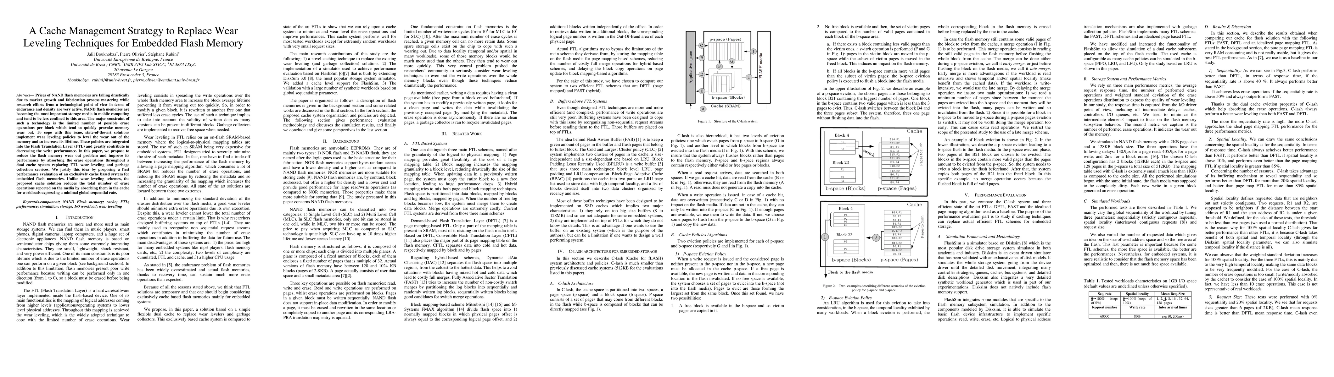 This paper proposes a dual cache management strategy to replace traditional wear leveling techniques for embedded flash memory, aiming to reduce memory wear out and improve performance by absorbing erase operations in the cache instead of the Flash Translation Layer (FTL). Initial performance evaluations show promising results for workloads with minimal global sequential access rates.