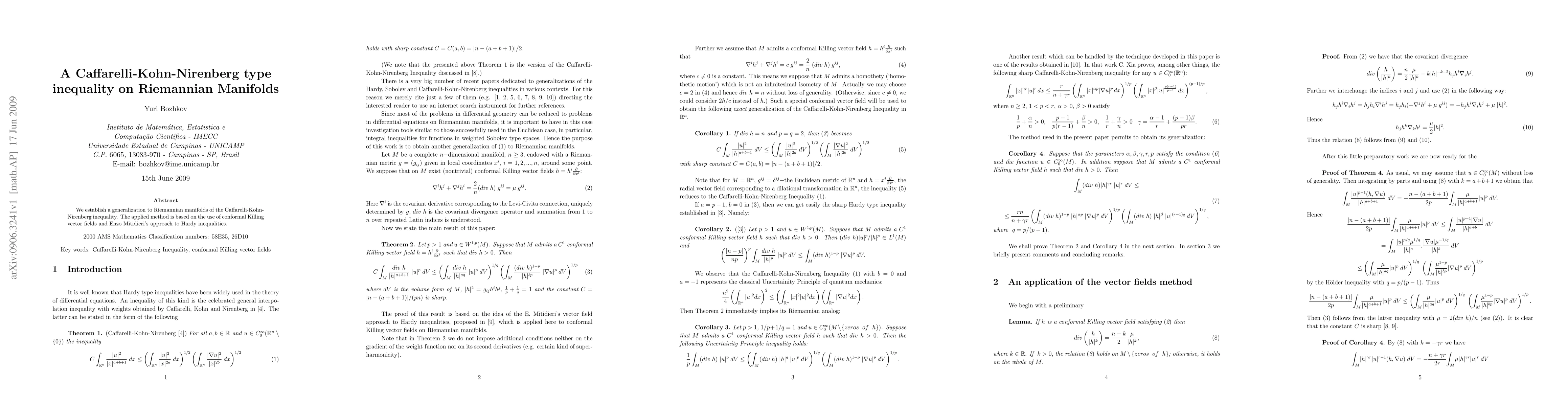 This paper generalizes the Caffarelli-Kohn-Nirenberg inequality to Riemannian manifolds using conformal Killing vector fields and Enzo Mitidieri's method for Hardy inequalities. The approach highlights novel techniques in differential geometry and functional analysis.