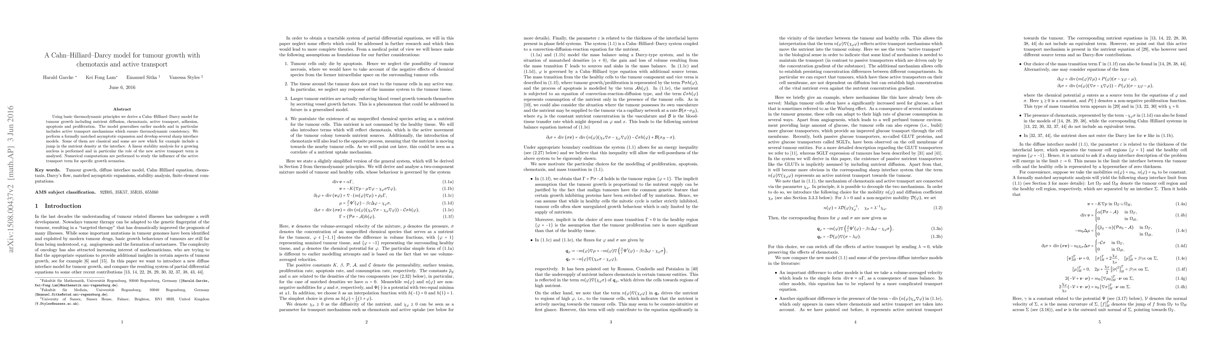 Using basic thermodynamic principles we derive a Cahn--Hilliard--Darcy model for tumour growth including nutrient diffusion, chemotaxis, active transport, adhesion, apoptosis and proliferation. The model generalises earlier models and in particular includes active transport mechanisms which ensure thermodynamic consistency. We perform a formally matched asymptotic expansion and develop several sharp interface models. Some of them are classical and some are new which for example include a jump in the nutrient density at the interface. A linear stability analysis for a growing nucleus is performed and in particular the role of the new active transport term is analysed. Numerical computations are performed to study the influence of the active transport term for specific growth scenarios.