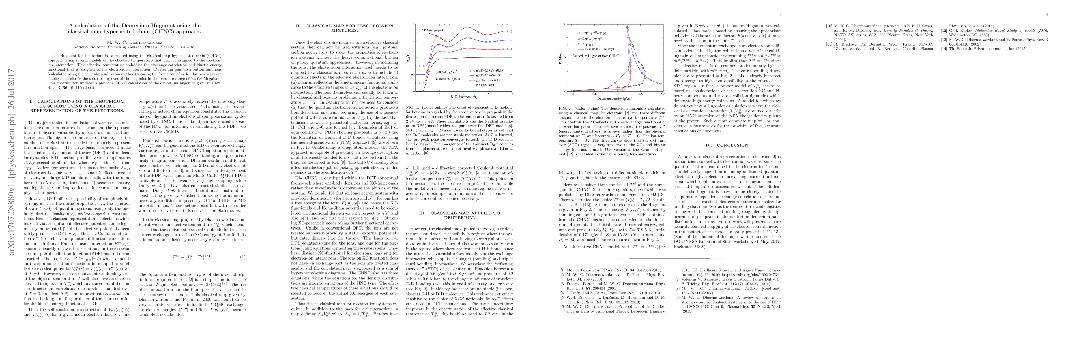 The Hugoniot for Deuterium is calculated using the classical-map hyper-netted-chain (CHNC) approach using several models of the effective temperature that may be assigned to the electron-ion interaction. This effective temperature embodies the exchange-correlation and kinetic energy functional that is assigned to the electron-ion interaction. Deuterium pair distribution functions (calculated using the neutral-pseudo atom method) showing the formation of molecular pre-peaks are displayed to clarify the soft-turning over of the hugoniot in the pressure range of 0.2-0.6 Megabars. This contribution updates a previous CHNC calculation of the deuterium hugoniot given in Phys. Rev. B, 66, 014110 (2002).