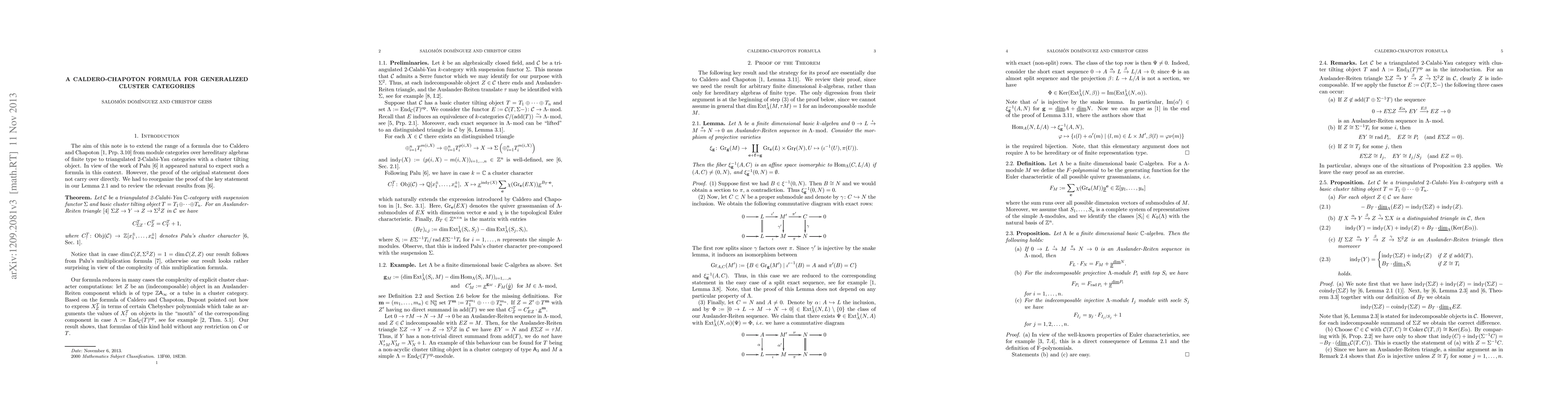 Summary: This paper extends the Caldero-Chapoton formula to generalized cluster categories, linking cluster characters in Auslander-Reiten sequences to cluster tilting objects via Auslander-Reiten triangles. It provides a new framework for understanding relationships in hereditary algebras of Dynkin type within these categories.