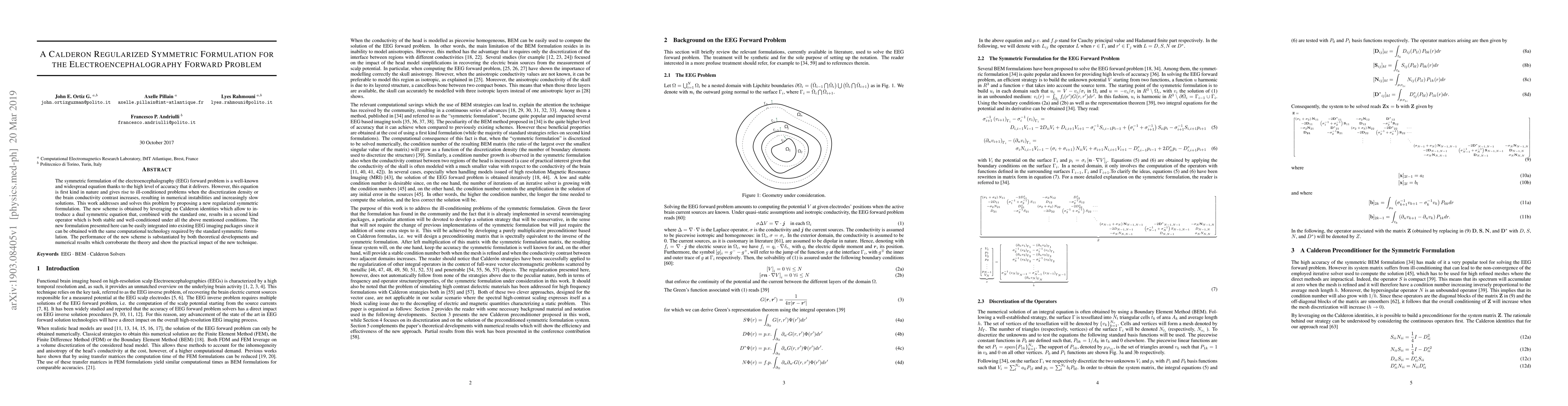 This paper proposes a Calderon regularized symmetric formulation to address numerical instability in the EEG forward problem, transforming the ill-conditioned first-kind equation into a stable second-kind operator. The new method is shown to be both theoretically sound and practically effective through numerical results.