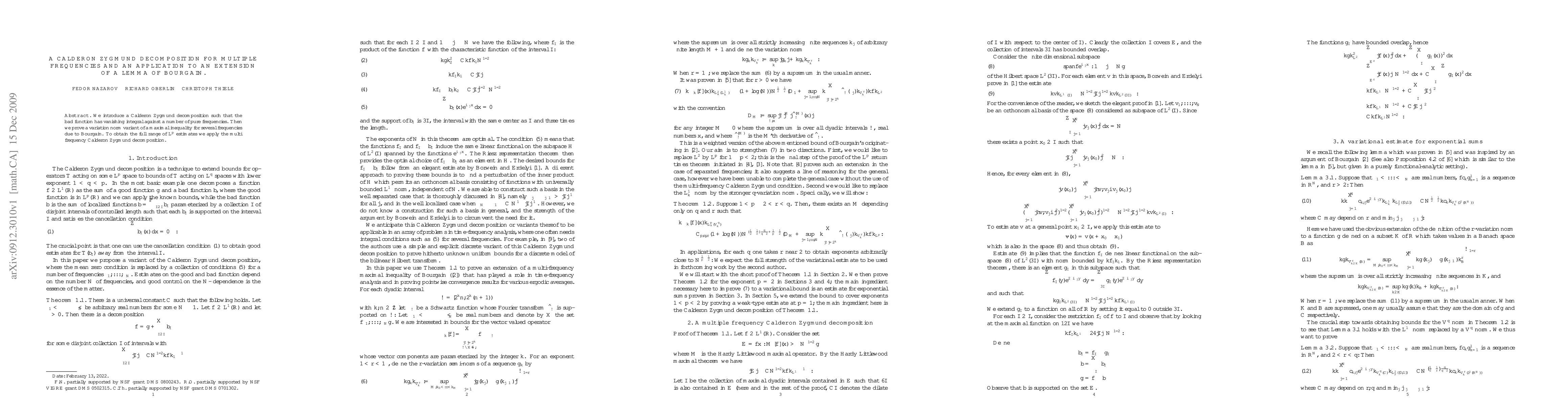 This paper introduces a Calderon Zygmund decomposition that handles multiple frequencies and applies it to an extension of Bourgain's lemma, proving a variation norm variant of maximal inequality for several frequencies and obtaining full range Lp estimates.