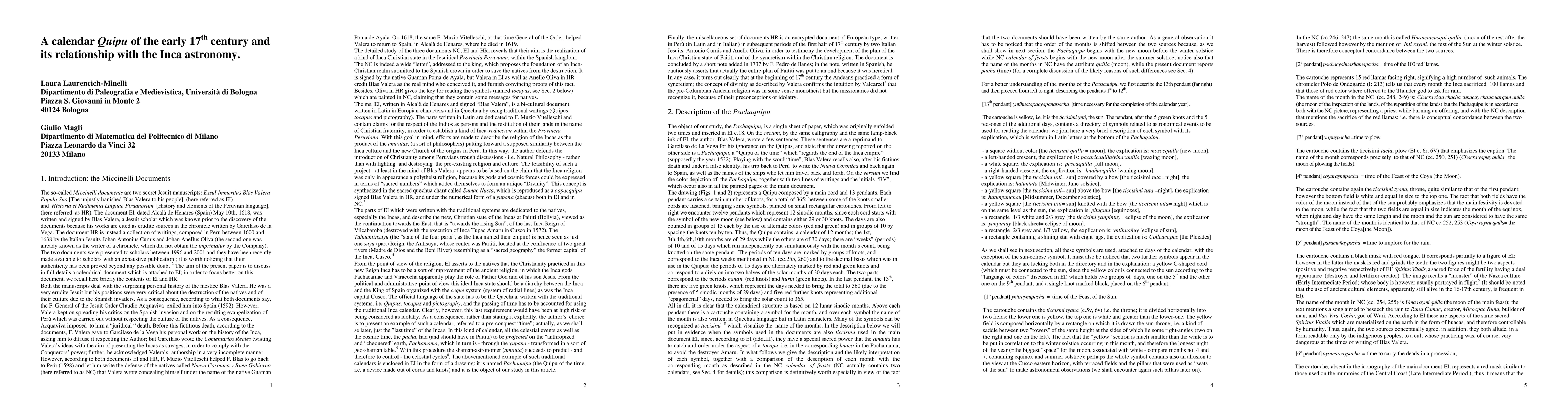 The so-called Miccinelli documents are a set of documents which were written by Jesuit scholars in Peru within the first half of the 17th century. Among such documents, one contains the depiction of a Quipu, that is, a device made out of cords of different nature and colors which, with the help of nodes, were used by the Incas for storing data. This Quipu is claimed by the author, Blas Valera, to be a reproduction of the Inca calendar of the year of the Spanish conquest. We give here a complete analysis of the astronomical events occurred in Cusco in that year, showing that they actually correspond closely to the data reported in the Quipu, and compare the calendrical information - such as the names and the rituals of each month - with those given by other documents, especially the Nuova Coronica by G. Poma de Ayala. The possible relevance of the document for the knowledge of the original Inca lore of the sky is discussed in details.
