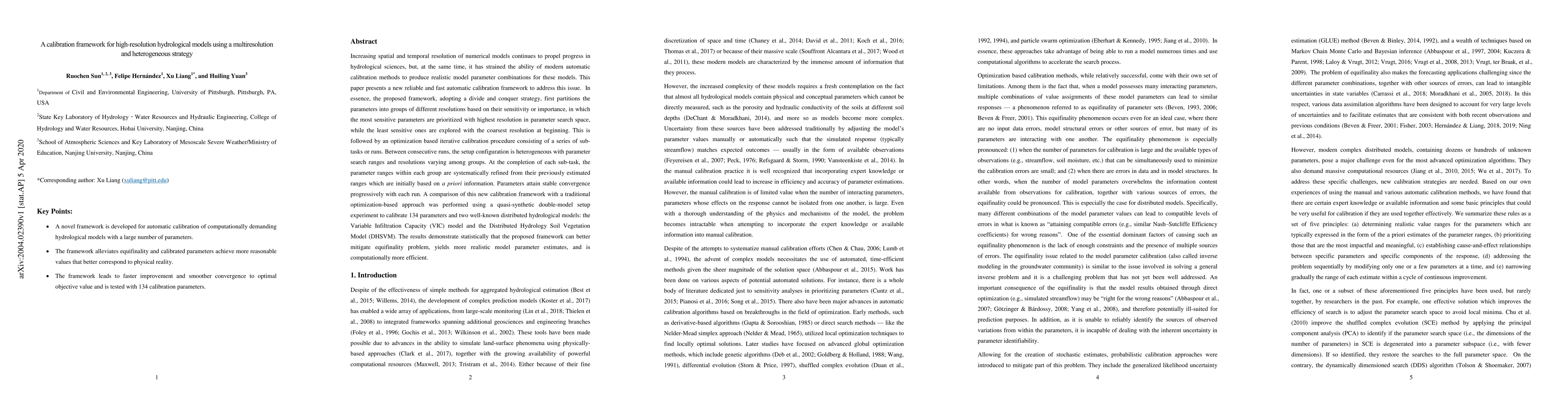 This paper introduces a new calibration framework for high-resolution hydrological models that employs a multiresolution and heterogeneous strategy to improve parameter estimation and efficiency. The framework prioritizes sensitive parameters with higher resolution and iteratively refines parameter ranges, demonstrating better performance in mitigating equifinality and achieving realistic parameter estimates compared to traditional methods.
