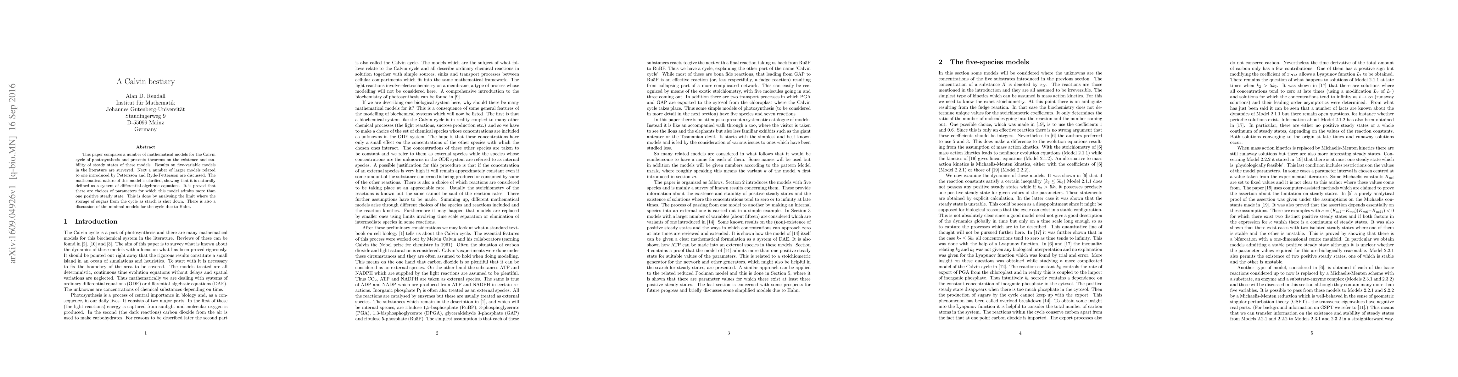 This paper compares a number of mathematical models for the Calvin cycle of photosynthesis and presents theorems on the existence and stability of steady states of these models. Results on five-variable models in the literature are surveyed. Next a number of larger models related to one introduced by Pettersson and Ryde-Pettersson are discussed. The mathematical nature of this model is clarified, showing that it is naturally defined as a system of differential-algebraic equations. It is proved that there are choices of parameters for which this model admits more than one positive steady state. This is done by analysing the limit where the storage of sugars from the cycle as starch is shut down. There is also a discussion of the minimal models for the cycle due to Hahn.