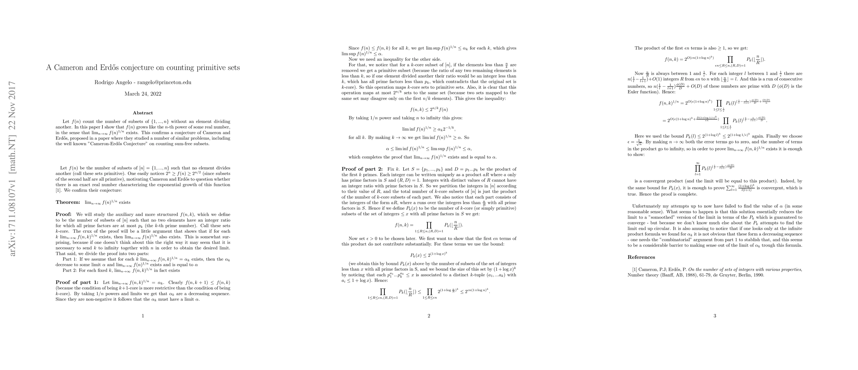 This paper confirms a conjecture by Cameron and Erdős regarding the growth rate of $f(n)$, which counts subsets of $\{1,...,n\}$ where no element divides another. The study shows that $f(n)$ grows asymptotically like the $n$-th power of a real number, specifically $\lim_{n\rightarrow \infty}f(n)^{1/n}$ exists.