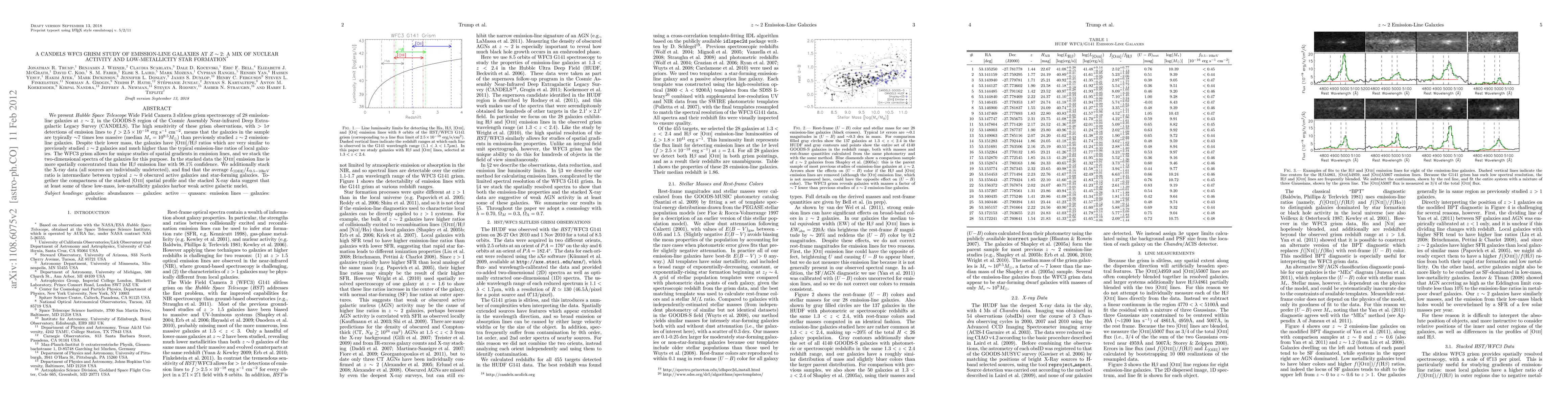 We present Hubble Space Telescope Wide Field Camera 3 slitless grism spectroscopy of 28 emission-line galaxies at z~2, in the GOODS-S region of the Cosmic Assembly Near-infrared Deep Extragalactic Legacy Survey (CANDELS). The high sensitivity of these grism observations, with 1-sigma detections of emission lines to f > 2.5x10^{-18} erg/s/cm^2, means that the galaxies in the sample are typically ~7 times less massive (median M_* = 10^{9.5} M_sun) than previously studied z~2 emission-line galaxies. Despite their lower mass, the galaxies have OIII/Hb ratios which are very similar to previously studied z~2 galaxies and much higher than the typical emission-line ratios of local galaxies. The WFC3 grism allows for unique studies of spatial gradients in emission lines, and we stack the two-dimensional spectra of the galaxies for this purpose. In the stacked data the OIII emission line is more spatially concentrated than the Hb emission line with 98.1 confidence. We additionally stack the X-ray data (all sources are individually undetected), and find that the average L(OIII)/L(0.5-10 keV) ratio is intermediate between typical z~0 obscured active galaxies and star-forming galaxies. Together the compactness of the stacked OIII spatial profile and the stacked X-ray data suggest that at least some of these low-mass, low-metallicity galaxies harbor weak active galactic nuclei.
