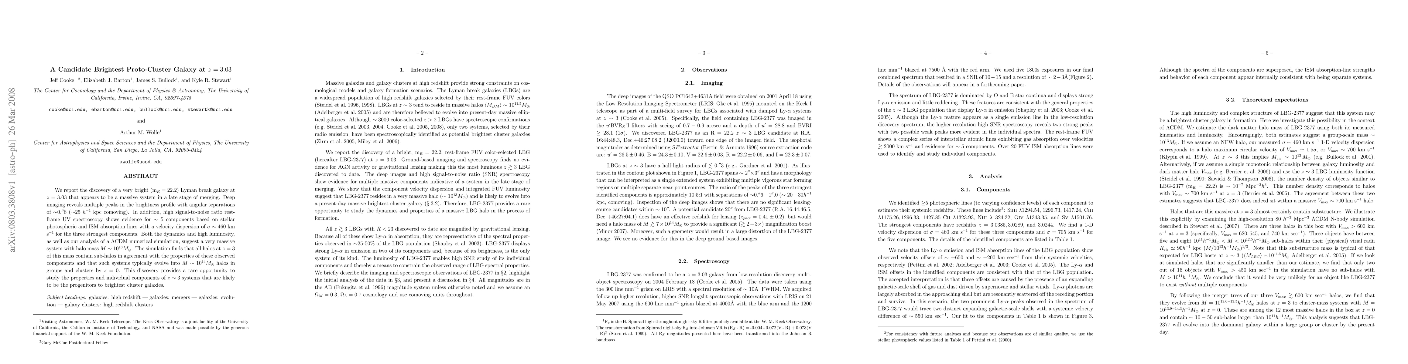 We report the discovery of a very bright (m_R = 22.2) Lyman break galaxy at z = 3.03 that appears to be a massive system in a late stage of merging. Deep imaging reveals multiple peaks in the brightness profile with angular separations of ~0.''8 (~25 h^-1 kpc comoving). In addition, high signal-to-noise ratio rest-frame UV spectroscopy shows evidence for ~5 components based on stellar photospheric and ISM absorption lines with a velocity dispersion of sigma ~460 km s^-1 for the three strongest components. Both the dynamics and high luminosity, as well as our analysis of a LCDM numerical simulation, suggest a very massive system with halo mass M ~ 10^13 M_solar. The simulation finds that all halos at z = 3 of this mass contain sub-halos in agreement with the properties of these observed components and that such systems typically evolve into M ~ 10^14 M_solar halos in groups and clusters by z = 0. This discovery provides a rare opportunity to study the properties and individual components of z ~ 3 systems that are likely to be the progenitors to brightest cluster galaxies.