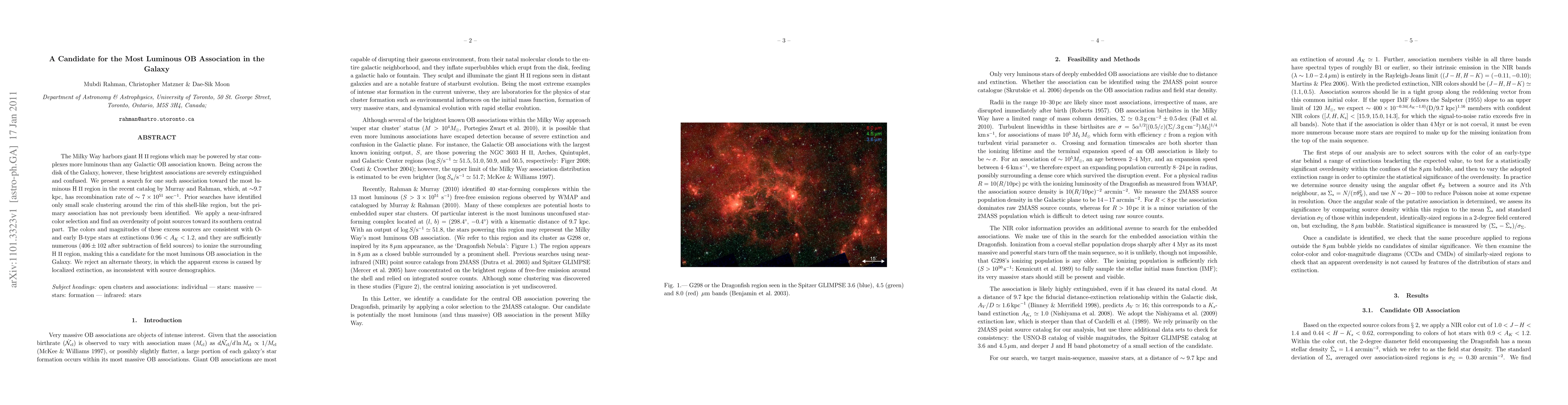 The Milky Way harbors giant H II regions which may be powered by star complexes more luminous than any Galactic OB association known. Being across the disk of the Galaxy, however, these brightest associations are severely extinguished and confused. We present a search for one such association toward the most luminous H II region in the recent catalog by Murray and Rahman, which, at ~9.7 kpc, has recombination rate of ~7x10^{51} sec$^{-1}$. Prior searches have identified only small scale clustering around the rim of this shell-like region, but the primary association has not previously been identified. We apply a near-infrared color selection and find an overdensity of point sources toward its southern central part. The colors and magnitudes of these excess sources are consistent with O- and early B-type stars at extinctions $0.96 < A_{K} < 1.2$, and they are sufficiently numerous (406 +/- 102 after subtraction of field sources) to ionize the surrounding H II region, making this a candidate for the most luminous OB association in the Galaxy. We reject an alternate theory, in which the apparent excess is caused by localized extinction, as inconsistent with source demographics.