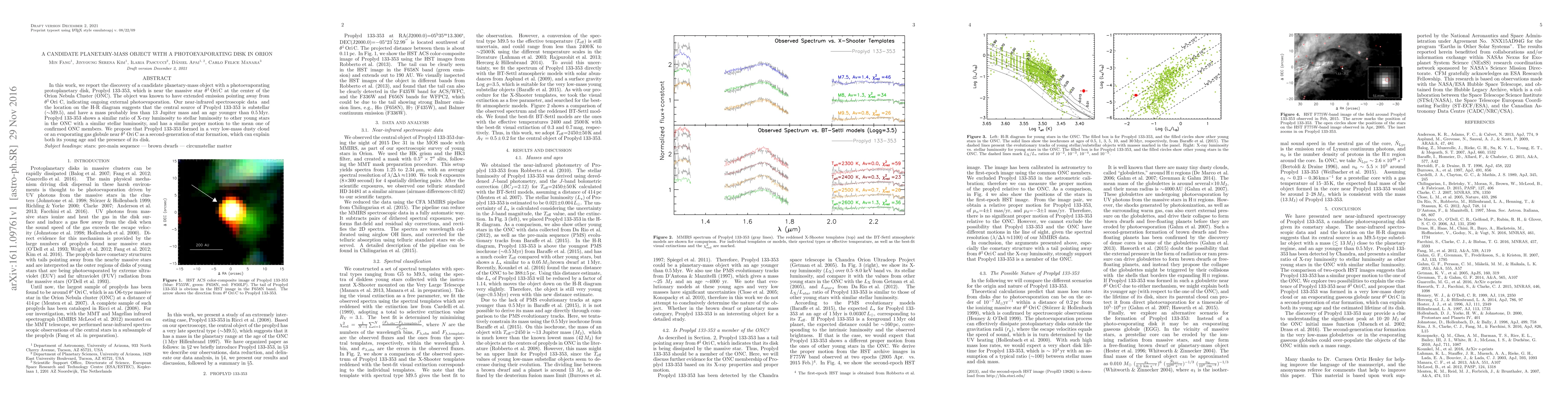 In this work, we report the discovery of a candidate planetary-mass object with a photoevaporating protoplanetary disk, Proplyd 133-353, which is near the massive star $\theta^{1}$ Ori C at the center of the Orion Nebula Cluster (ONC). The object was known to have extended emission pointing away from $\theta^{1}$ Ori C, indicating ongoing external photoevaporation. Our near-infrared spectroscopic data suggests that the central source of Proplyd 133-353 is substellar ($\sim$M9.5), might have a mass probably less than 13 Jupiter mass and an age younger than 0.5 Myr. Proplyd 133-353 shows a similar ratio of X-ray luminosity to stellar luminosity to other young stars in the ONC with a similar stellar luminosity, and has a similar proper motion to the mean one of confirmed ONC members. We propose that Proplyd 133-353 was formed in a very low-mass dusty cloud near $\theta^{1}$ Ori C as a second-generation of star formation, which can explain both its young age and the presence of its disk.