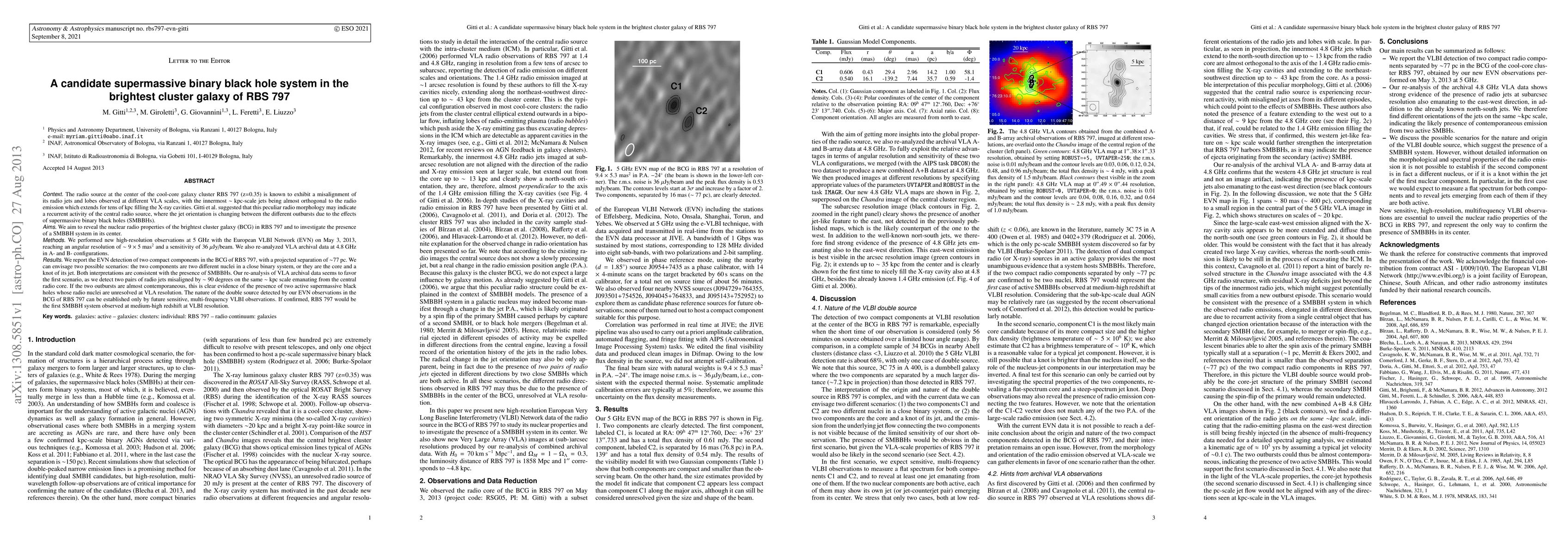 This paper reports the detection of two compact radio components in the brightest cluster galaxy of RBS 797, suggesting the presence of a candidate supermassive binary black hole system. High-resolution EVN observations reveal a projected separation of ~77 pc, supporting either a binary black hole scenario or a core-jet structure.