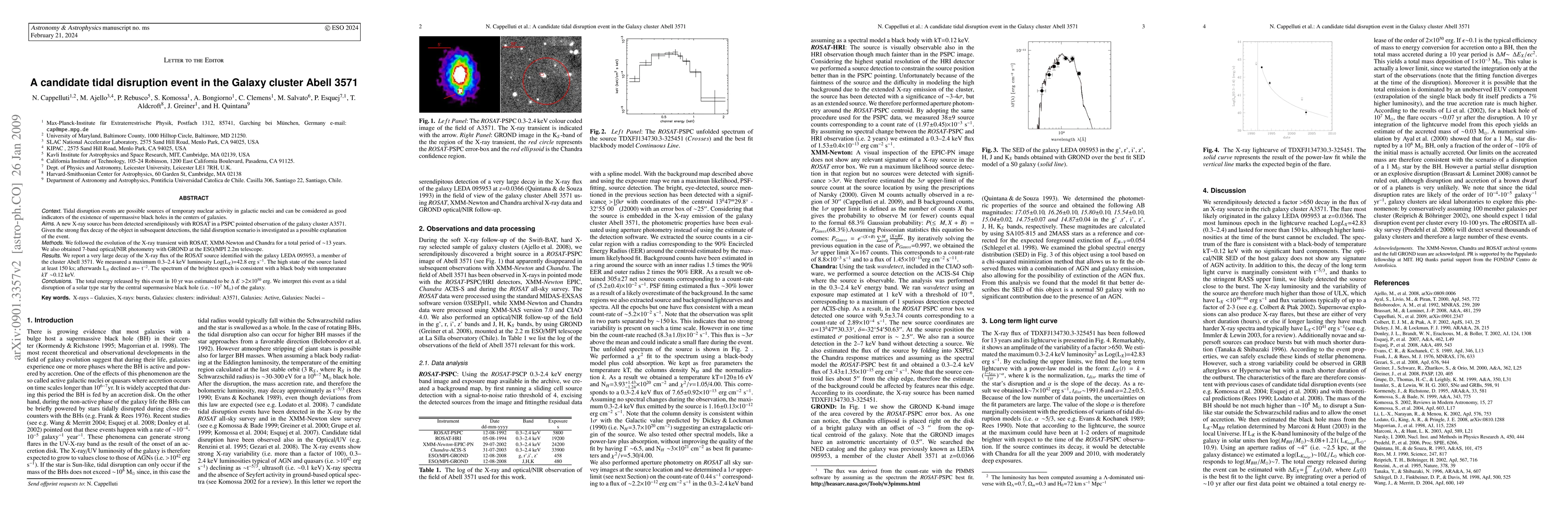 Tidal disruption events are possible sources of temporary nuclear activity in galactic nuclei and can be considered as good indicators of the existence of super massive black holes in the centers of galaxies. A new X-ray source has been serendipitously detected with ROSAT in a PSPC pointed observation of the galaxy cluster A3571. Given the strong flux decay of the object in subsequent detections, the tidal disruption scenario is investigated as possible explanationof the event. We followed up the evolution of the X-ray transient with ROSAT, XMM-Newton and Chandra for a total period of ~13 years. We also obtained 7-band optical/NIR photometry with GROND at the ESO/MPI 2.2m telescope. We report a very large decay of the X-ray flux of ROSAT source identified with the galaxy LEDA 095953 a member of the cluster Abell 3571. We measured a maximum 0.3-2.4 keV luminosity Log(L_X)=42.8 erg s^-1. The high state of the source lasted at least 150 ks, afterwards L_X declined as ~t^-2. The spectrum of the brightest epoch is consistent with a black body with temperature kT ~0.12 keV. The total energy released by this event in 10 yr was estimated to be Delta_E>2x10^50 erg. We interpret this event as a tidal disruption of a solar type star by the central supermassive black hole (i.e. ~10^7 M_sun) of the galaxy.