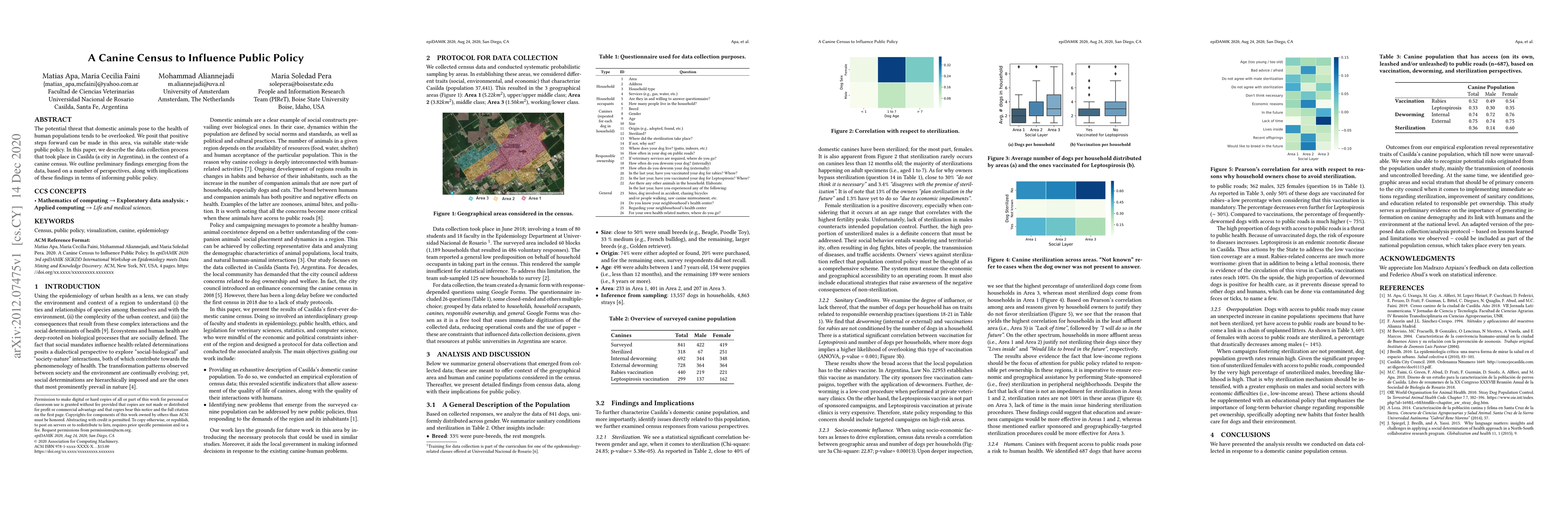 The potential threat that domestic animals pose to the health of human populations tends to be overlooked. We posit that positive steps forward can be made in this area, via suitable state-wide public policy. In this paper, we describe the data collection process that took place in Casilda (a city in Argentina), in the context of a canine census. We outline preliminary findings emerging from the data, based on a number of perspectives, along with implications of these findings in terms of informing public policy.