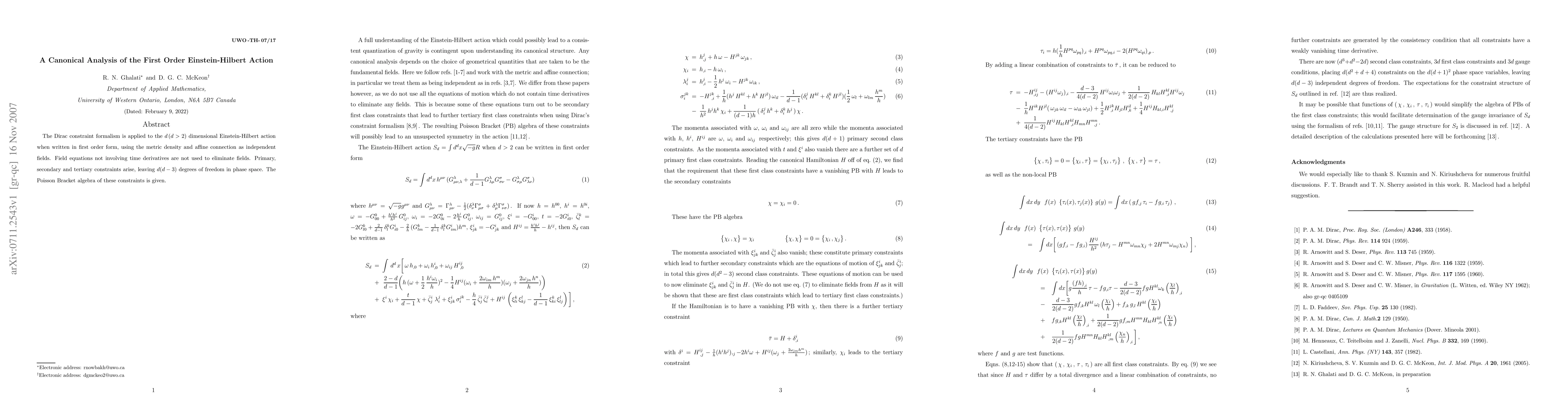 This paper applies the Dirac constraint formalism to the first-order Einstein-Hilbert action in d dimensions, identifying primary, secondary, and tertiary constraints that reduce the phase space degrees of freedom to d(d-3). The Poisson Bracket algebra of these constraints is also derived.