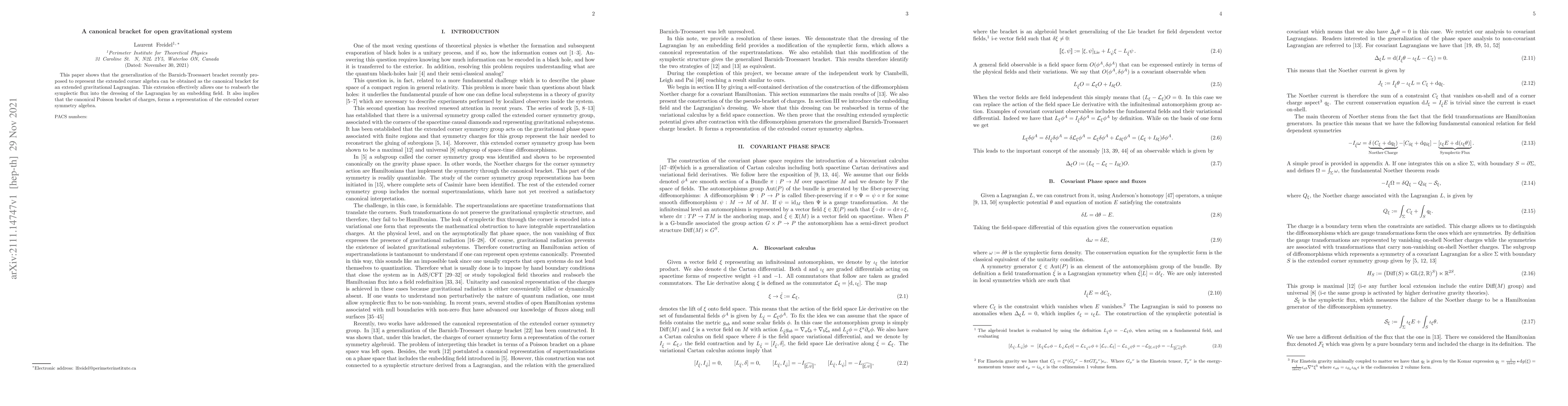 This paper demonstrates that the generalized Barnich-Troessaert bracket can serve as the canonical bracket for an extended gravitational Lagrangian, enabling the reabsorption of symplectic flux into the Lagrangian's embedding field. It also shows that the canonical Poisson bracket of charges represents the extended corner symmetry algebra.