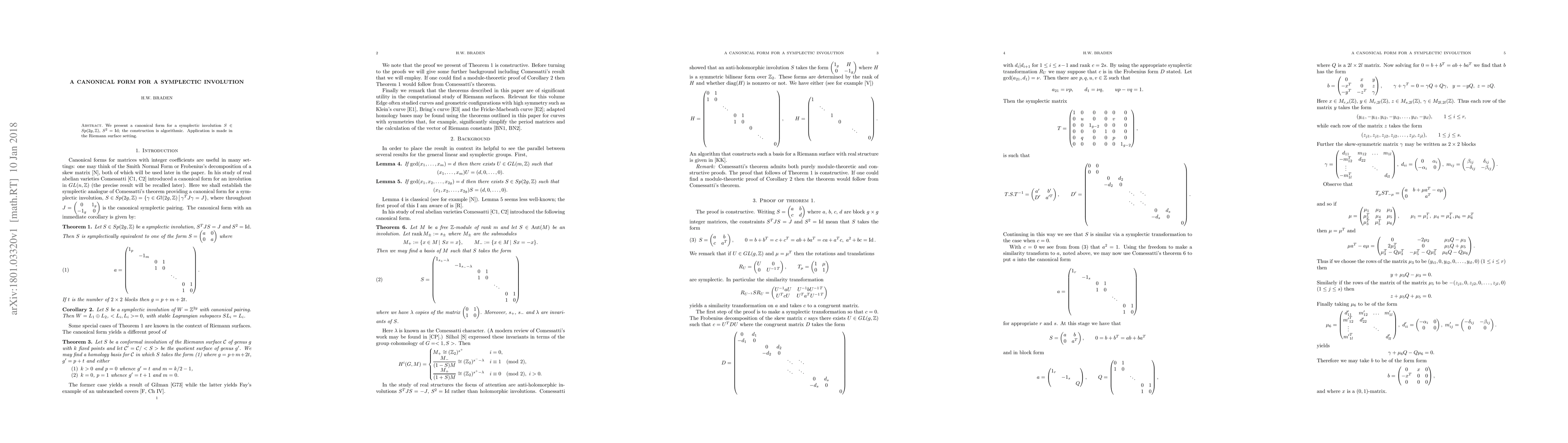 We present a canonical form for a symplectic involution $S\in Sp(2g,\mathbb{Z})$, $S^2=1$; the construction is algorithmic. Application is made in the Riemann surface setting.